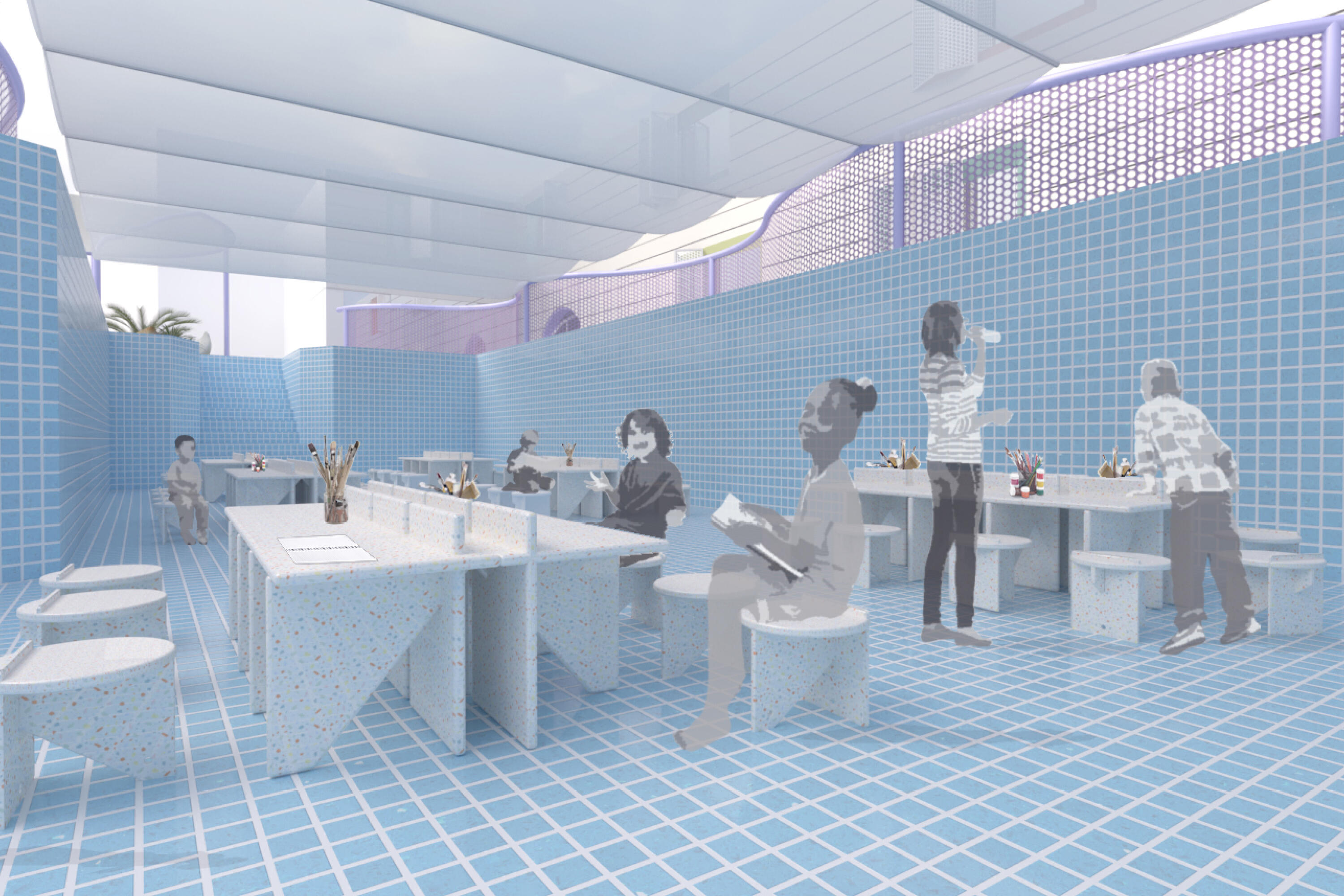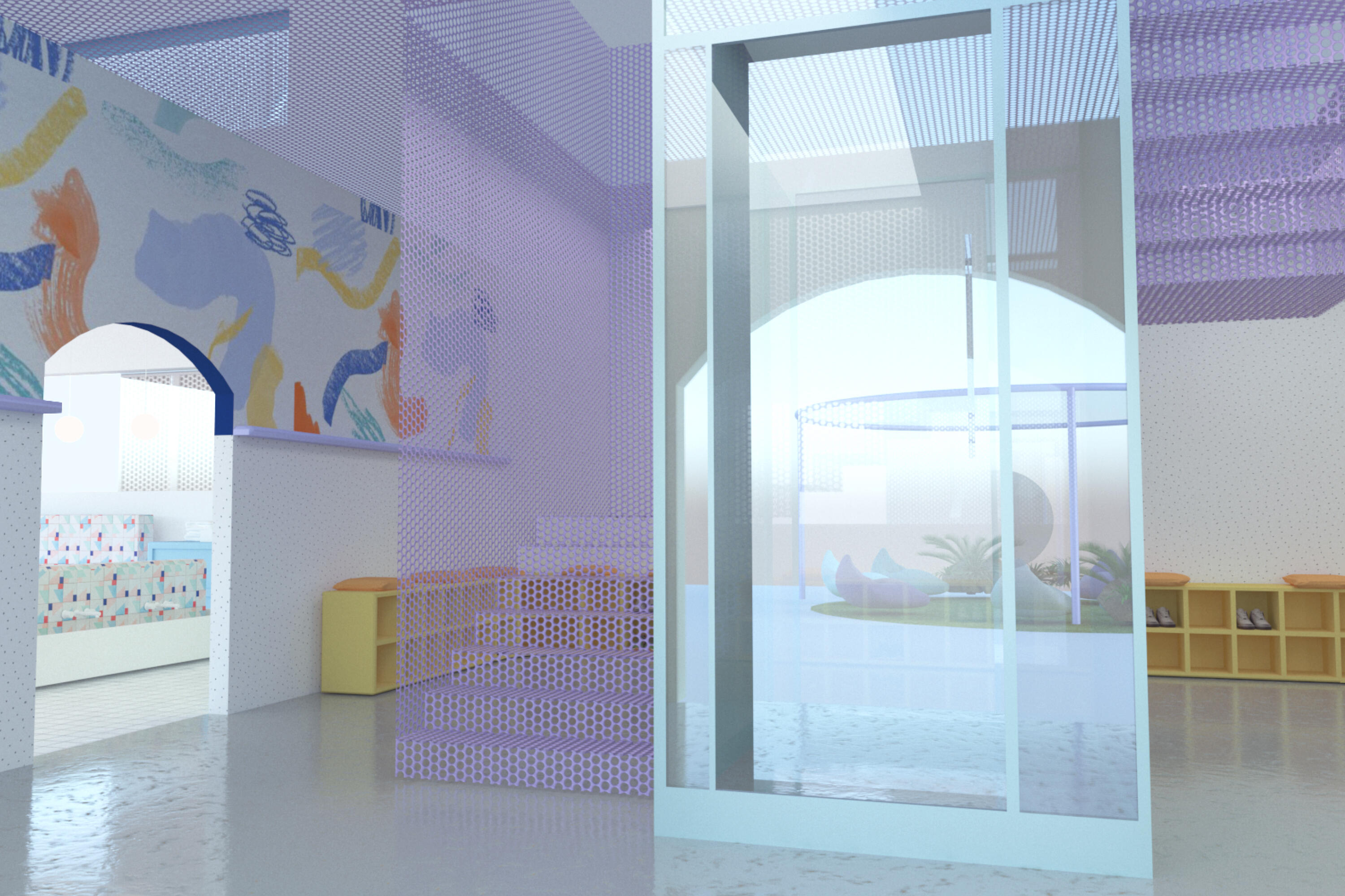 Umnutzung eines alten Hotelgebäudes zu einem spielerischen Raum für Kinder eines Flüchtlingslagers. Das höchste Ziel ist es, dass sich die Kinder sicher fühlen und sie aus dem Alltag ausbrechen können, sobald sie den Raum betreten. Sie sollen sich fühlen, als gehöre der Raum ihnen.