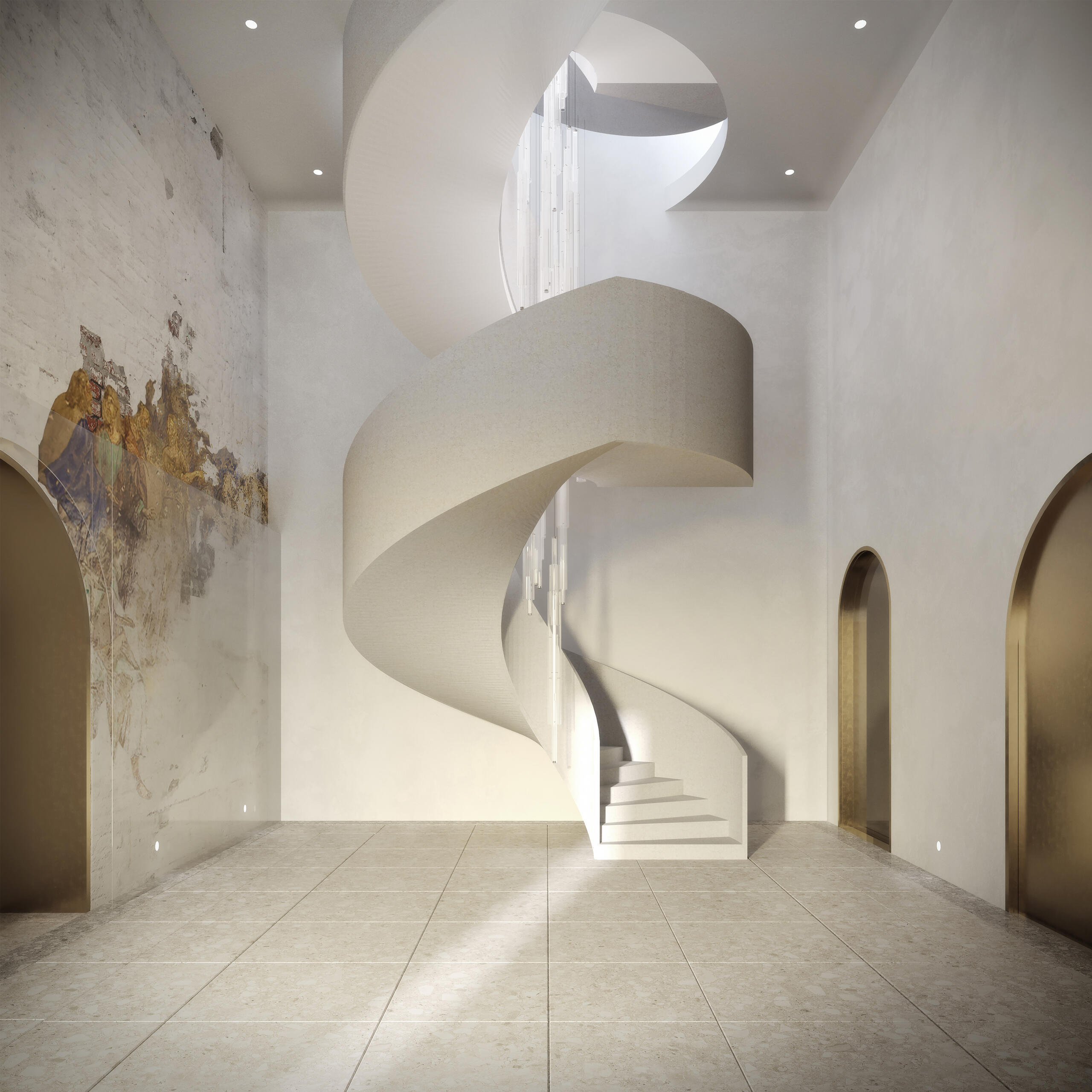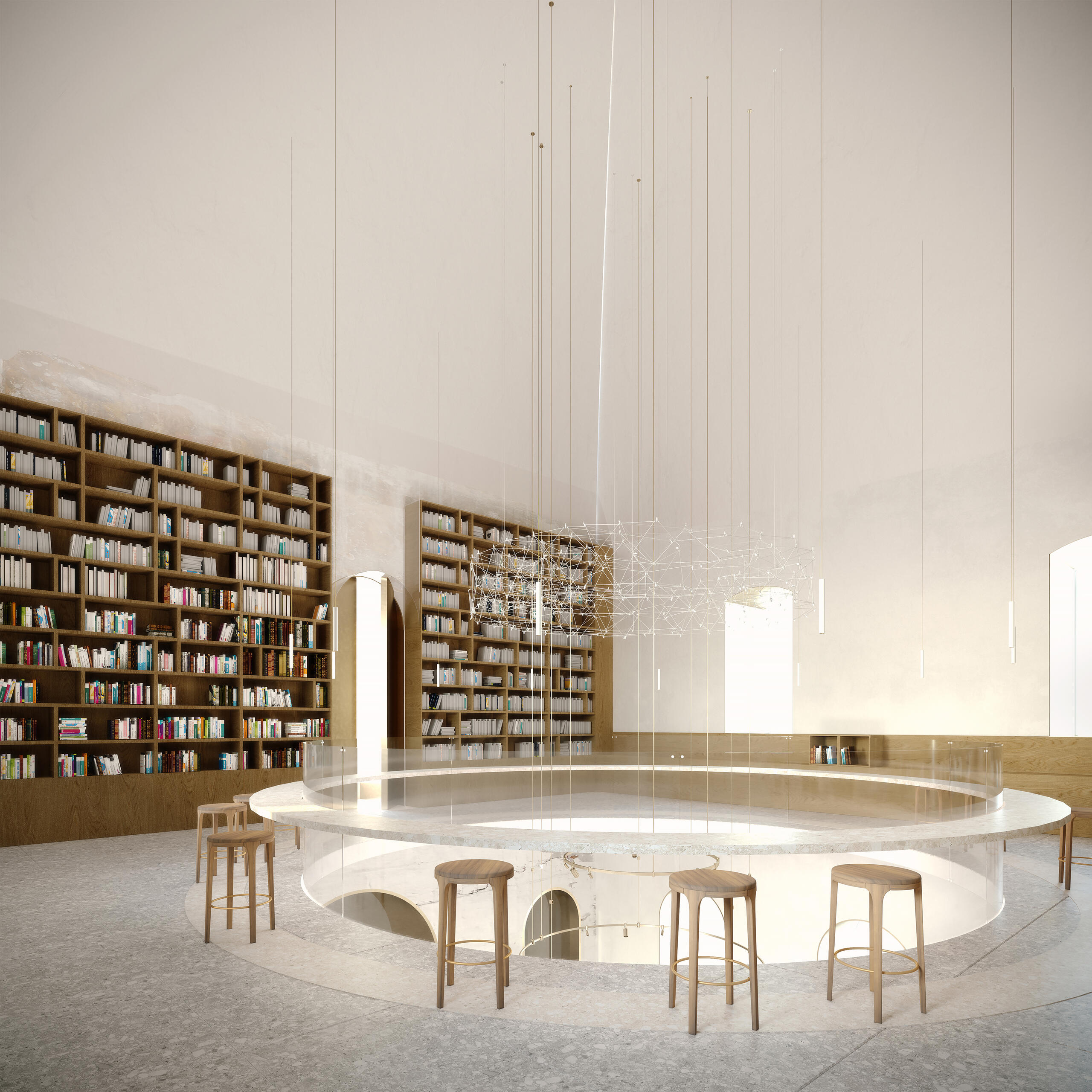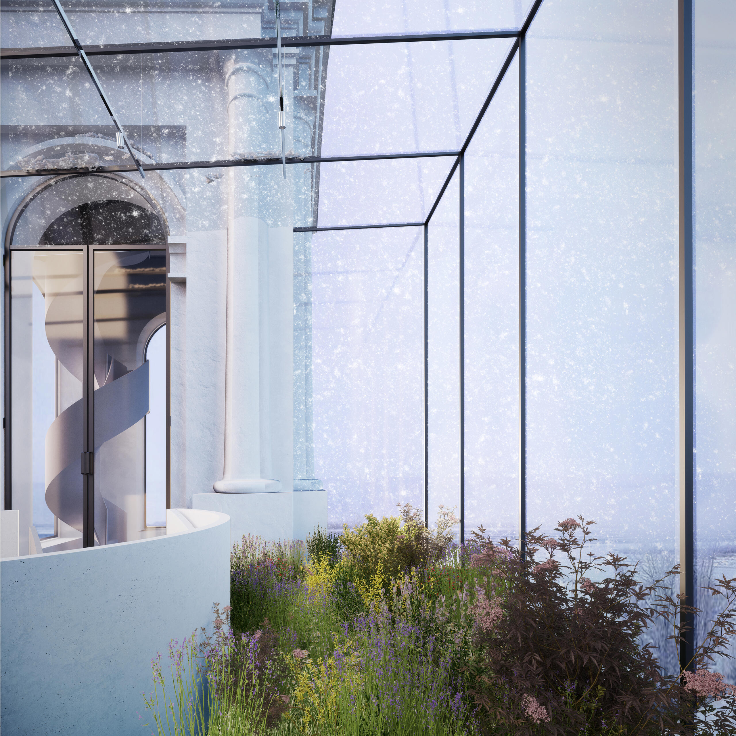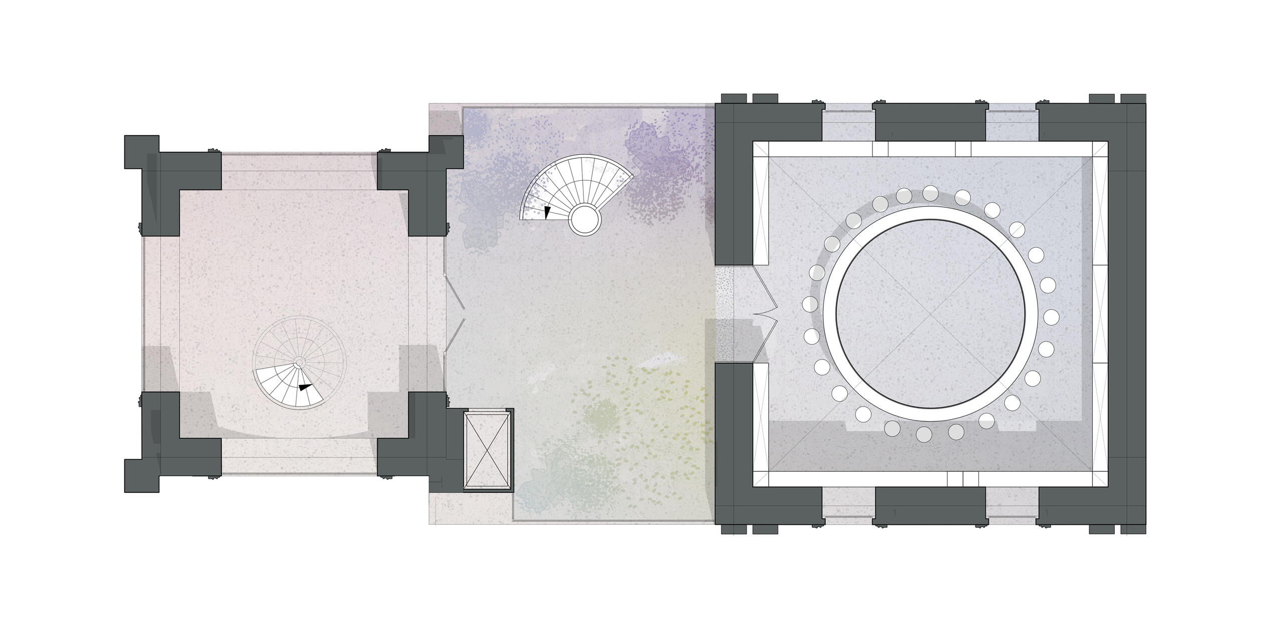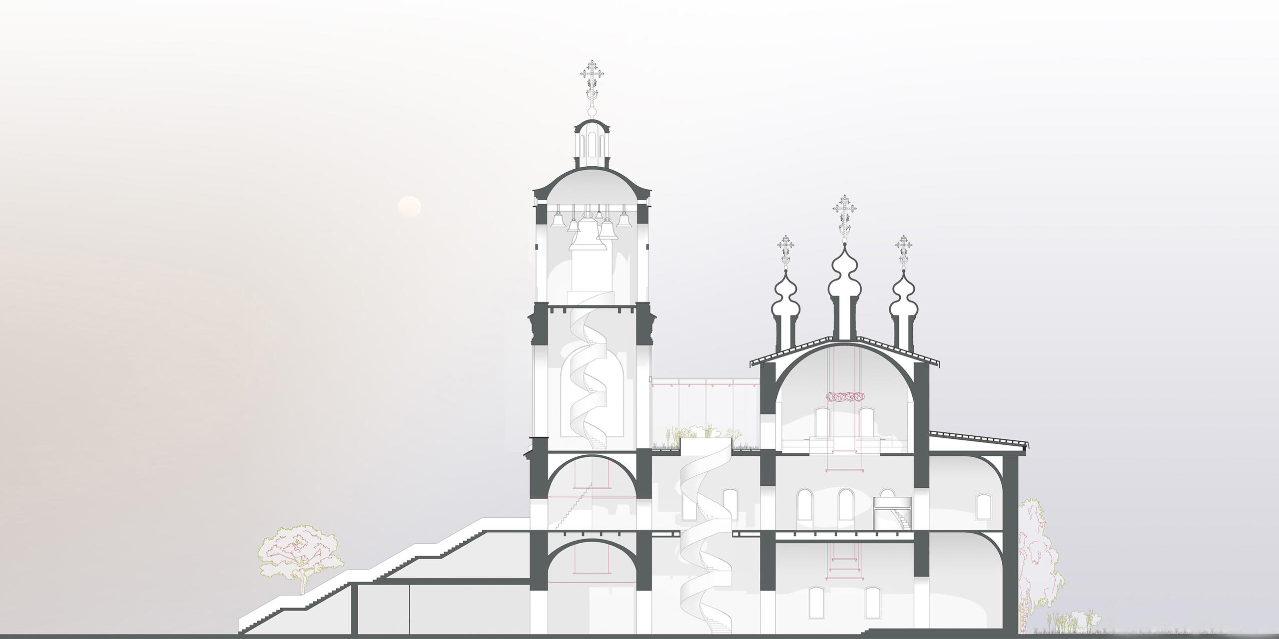 In meiner Masterarbeit wird die These aufgestellt, eine Revitalisierung verlassender Dörfer in Russland herbeizuführen. Kirchen, sowie örtliche Rath user a sollen hierbei als Schlüsselbausteine dienen und architektonisch bearbeitet werden. Anhand der untersuchten Daten wurde ein typisches Projekt zur Restaurierung von Kirchen am Beispiel der Himmelfahrtkirche im Region Twer, Russland untersucht und begründet. Mein Projekt sieht eine Konzeptionierung für insgesamt drei Zielgruppen vor: 1) Erwachsene, die älter als 45 Jahre sind und im Dorf leben; 2) Kinder und Jugendliche, die im Dorf wohnen oder dieses im Sommer besuchen; 3) Erwachsene, die älter als 30 Jahre sind und sich entschieden haben aus der Stadt aufs Land zu ziehen. Diese Gruppe gilt als Priorität für das Projekt, da die Suburbanisierung dieser Zielgruppe eine Revitalisierung der Dörfer ermöglicht und die Intention der Arbeit widerspiegelt. In meinem Projekt sind Räume und Funktionen für die einzelnen Zielgruppe definiert: Im Erdgeschoss befindet sich die Kirche, das Büro des Predigers, sowie Lager und Sanitärräume. Die Kirche wurde im Erdgeschoss untergebracht, da ihre Zielgruppe eine meist ältere Bevölkerung vorweist und somit ein barrierefreier Zugang gewährleistet werden muss. Zudem ist, wie in der Erzählung bereits erläutert, die Unterkirche älter, historischer und authentischer. Ein weiterer Faktor für die Platzierung der Kirche auf der ersten Ebene war das Beerdigungsszenario. Durch die Platzierung der Kirche oberhalb des EG s ist das Beerdigungsszenario, das in der Kirche stattfindet, nicht durchführbar. In den oberen Etagen befinden sich multifunktionale Räume, die unterschiedliche Funktionen erfüllen: Treffpunkte, Workshops und Seminare. Im Hauptraum befindet sich ein zylinderförmiges Objekt, das als Ablage für einige Möbel dient. Auch im Inneren des Objekts wird eine interne Treppe nach oben platziert. Diese Option ist für das Szenario von Hauptversammlungen und Versammlungen vorgesehen. Die untere Ebene dieses Objektes liegt leicht über dem Boden, so dass sich der Lehrer bei Kursen leicht über dem Klassenzimmer befindet. Der Hauptraum der Kirche ist in zwei Ebenen aufgeteilt. Auf der zweiten Ebene befinden sich ein Arbeitsbereich und eine Bibliothek. Alle Ebenen werden durch einen Aufzug und eine Treppe vertikal verbunden. Im 2. OG befindet sich ein Wintergarten. Der Glockenturm bleibt unverändert. Es ist ein historischer Teil des Gebäudes, der seine ursprüngliche Funktion so weit wie möglich beibehält. So gibt es im 1. Level des Glockenturms eine Aussichtsplattform, sowie einen Platz, welcher den Besuchern Raum zur Erholung bietet. Auf der oberen Etage des Glockenturms werden die Glocken nachgebildet, um einheimische Handwerker in der Schule der Glockengießer Meisterkurse vor Ort zu ermöglichen. Des Weiteren können hier Funktionen wie Hochzeitsfotoshootings und die einer Aussichtsplattform stattfinden.