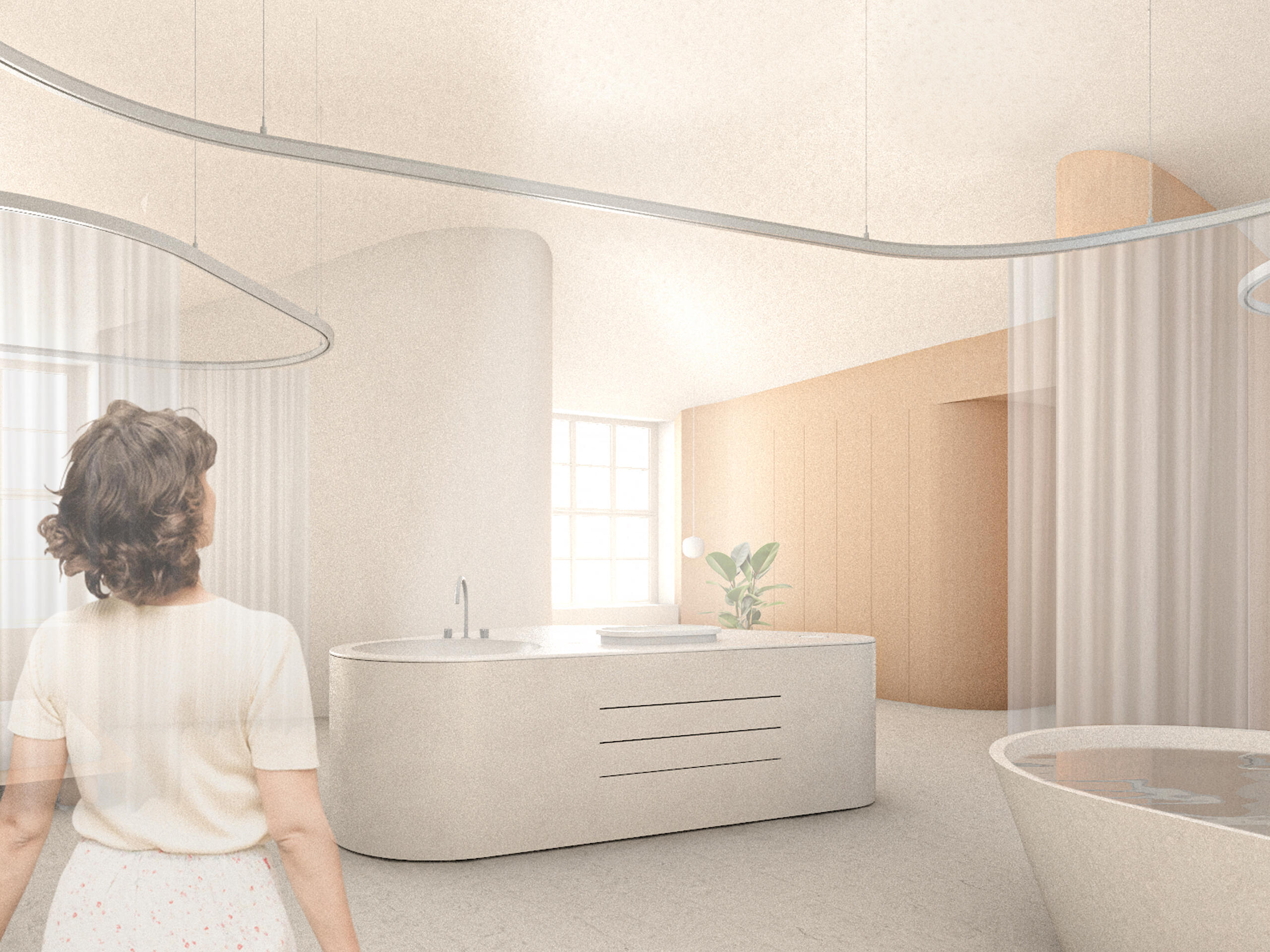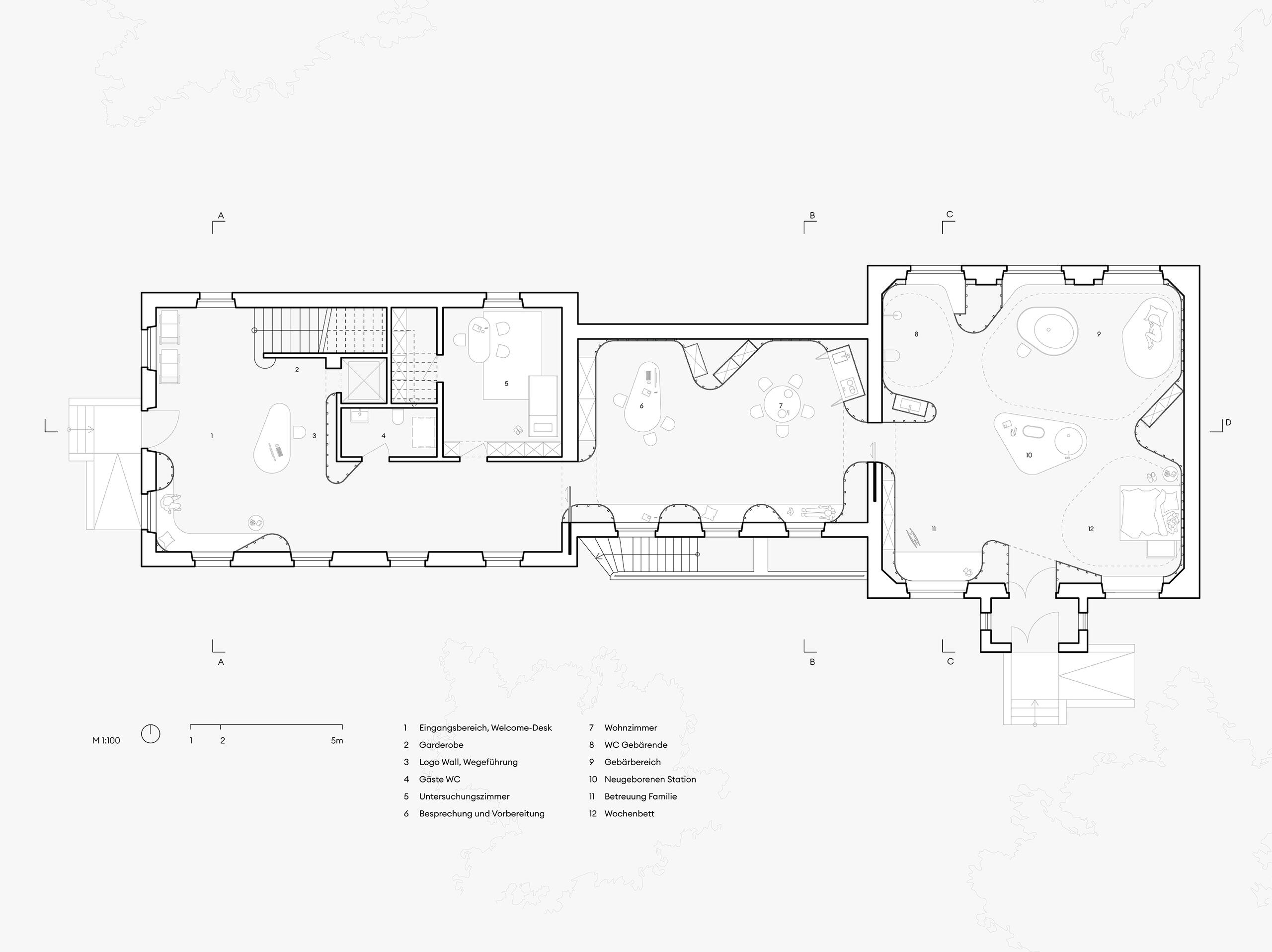 Der erste Raum, den wir als Mensch pränatal erleben, ist der natürlichste aller Räume: Der Uterus unserer Mutter. Im Moment der Geburt verlassen wir diesen ungestalteten und natürlichen Raum, der uns die letzten 9 Monate beherbergt hat und erfahren den ersten neonatalen, von Menschen geschaffenen Raum: Das Geburtenzimmer. In dem Geburtshaus „Advena“ in Neuhausen zitiert die Innenarchitektur diesen Übergang. Die organischen Wände, die Deckenöffnung, die farbliche Zurückgenommenheit und das gedämpfte Licht zitieren den Mutterleib und seine Formgebung. Um diesen Effekt zu erzielen wurden die in den Innenraum gelegten Rundungen von den Bewegungsabläufen und Körperverhältnissen schwangerer Frauen abgeleitet. Dies erzeugt nicht nur ein ästhetisches Gesamtbild sondern erfüllt auch den wichtigsten funktionalen Anspruch an den Raum: Die Unterstützung des natürlichen Geburtsablaufes. Allerdings sollen die Rundungen nicht nur die Schwangere unterstützen. Die anwesende Hebamme muss ebenfalls unterstützt werden, um der Gebärenden die perfekte Geburt zu ermöglichen. Daher wurde ihr Bewegungsablauf und Platzbedarf während der Geburt mit in die Formstudien des Geburtenzimmers einbezogen. (Fritz Buziek)