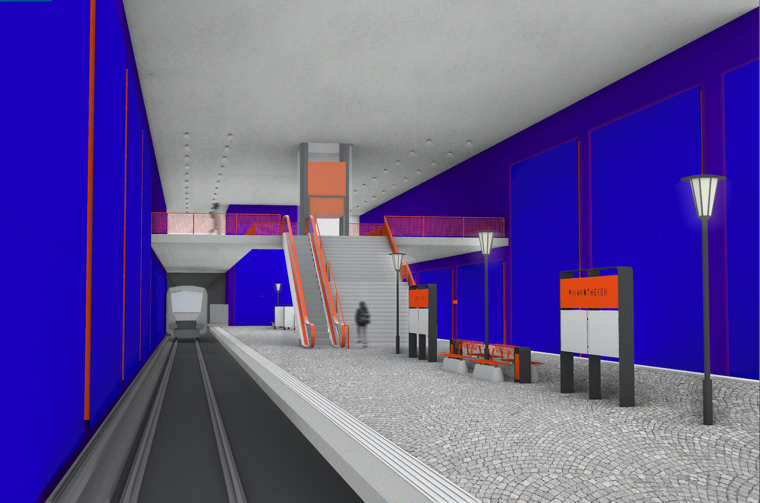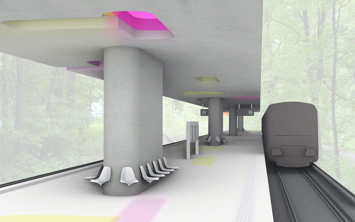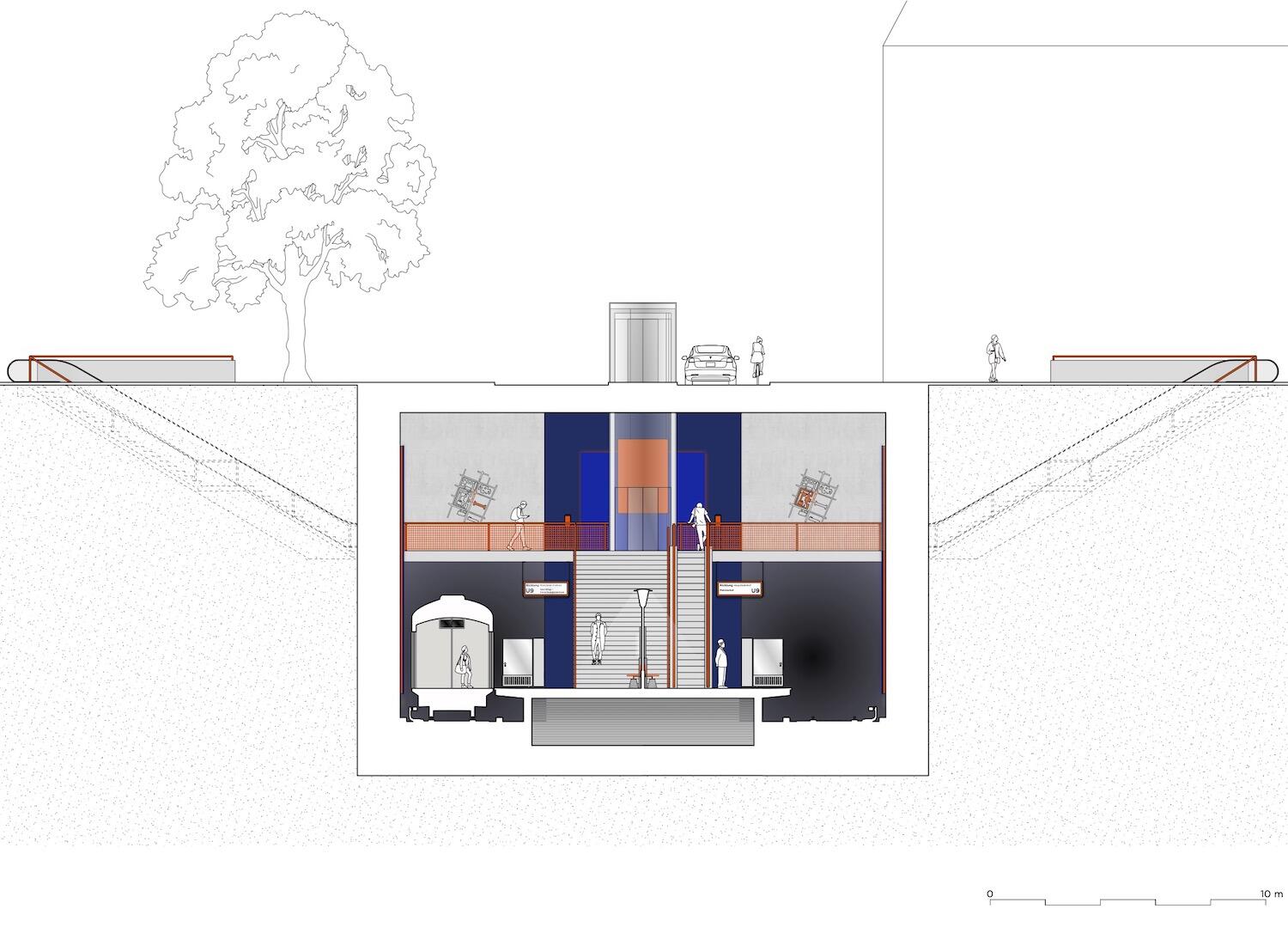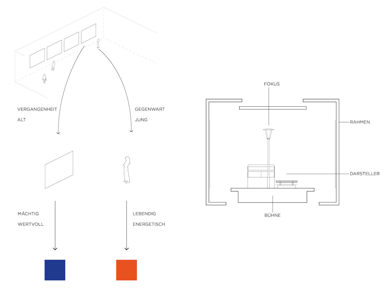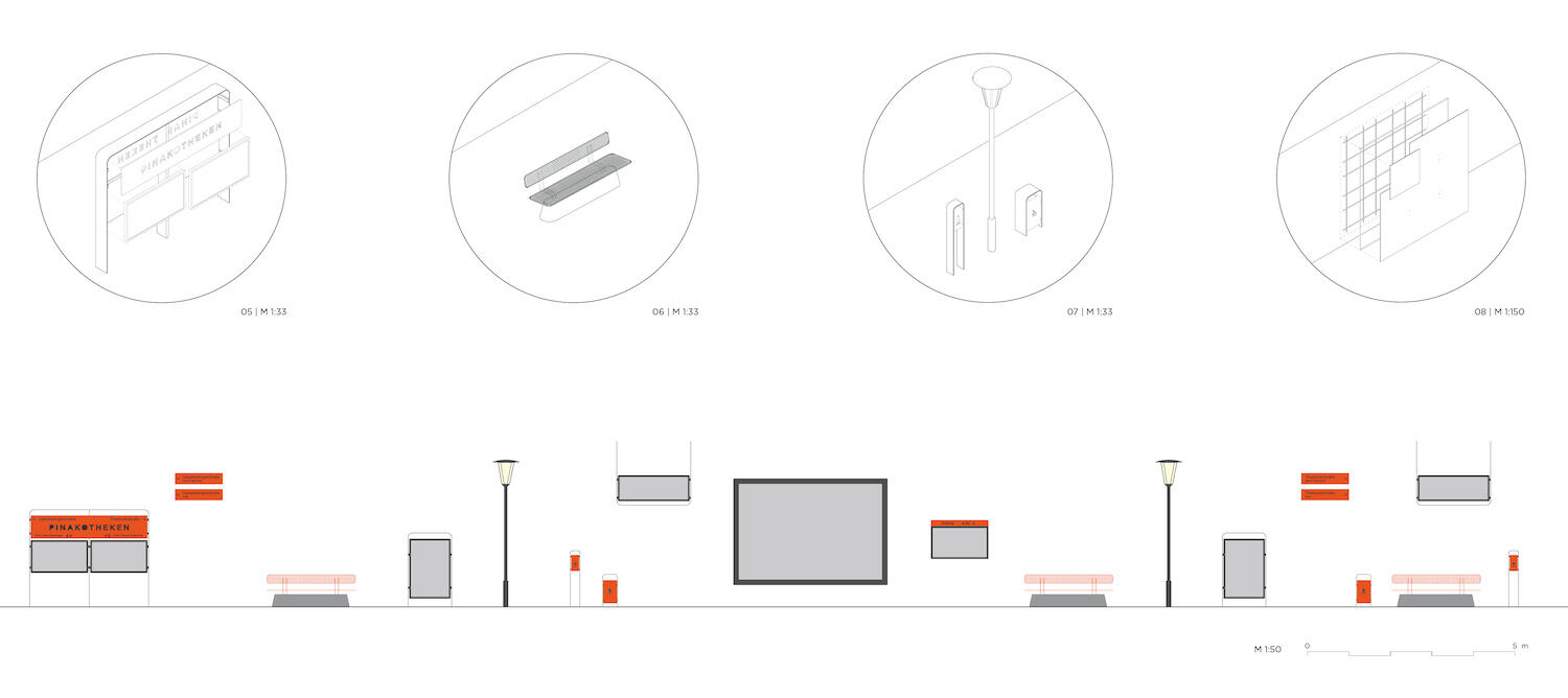 Das Areal rund um die Pinakotheken in München ist von starken Kontrasten geprägt. Hier treffen das Alte, Vergangene und das Junge, Gegenwärtige aufeinander. Tagsüber dominieren die mächtigen Bauten mit großzügigen Freiflächen. Nachts treten die Gebäude zurück, und das Innere der Museen tritt nach Außen. Beleuchtete Fenster strahlen warmes Licht auf die Freiflächen, die im Schutz der Dunkelheit zur Bühne für die jungen Menschen werden. Der Entwurf baut auf den verschiedenen atmosphärischen Zuständen des Ortes auf und setzt sich mit der Wechselwirkung zwischen Gegenwart und Vergangenheit auseinander. Die Vergangenheit bildet den Rahmen, in dem wir uns bewegen. Alltägliche Elemente aus dem öffentlichen Raum, bilden die Bühne und setzen den Fokus auf die Gegenwart. Die Darsteller auf der Bühne, verkörpern das Gegenwärtige. Es entsteht eine wechselseitige Beziehung zwischen - Tag und Nacht - Rahmen und Bühne - Vergangenheit und Gegenwart. (Leoni Haslberger und Helen Müllejans)
