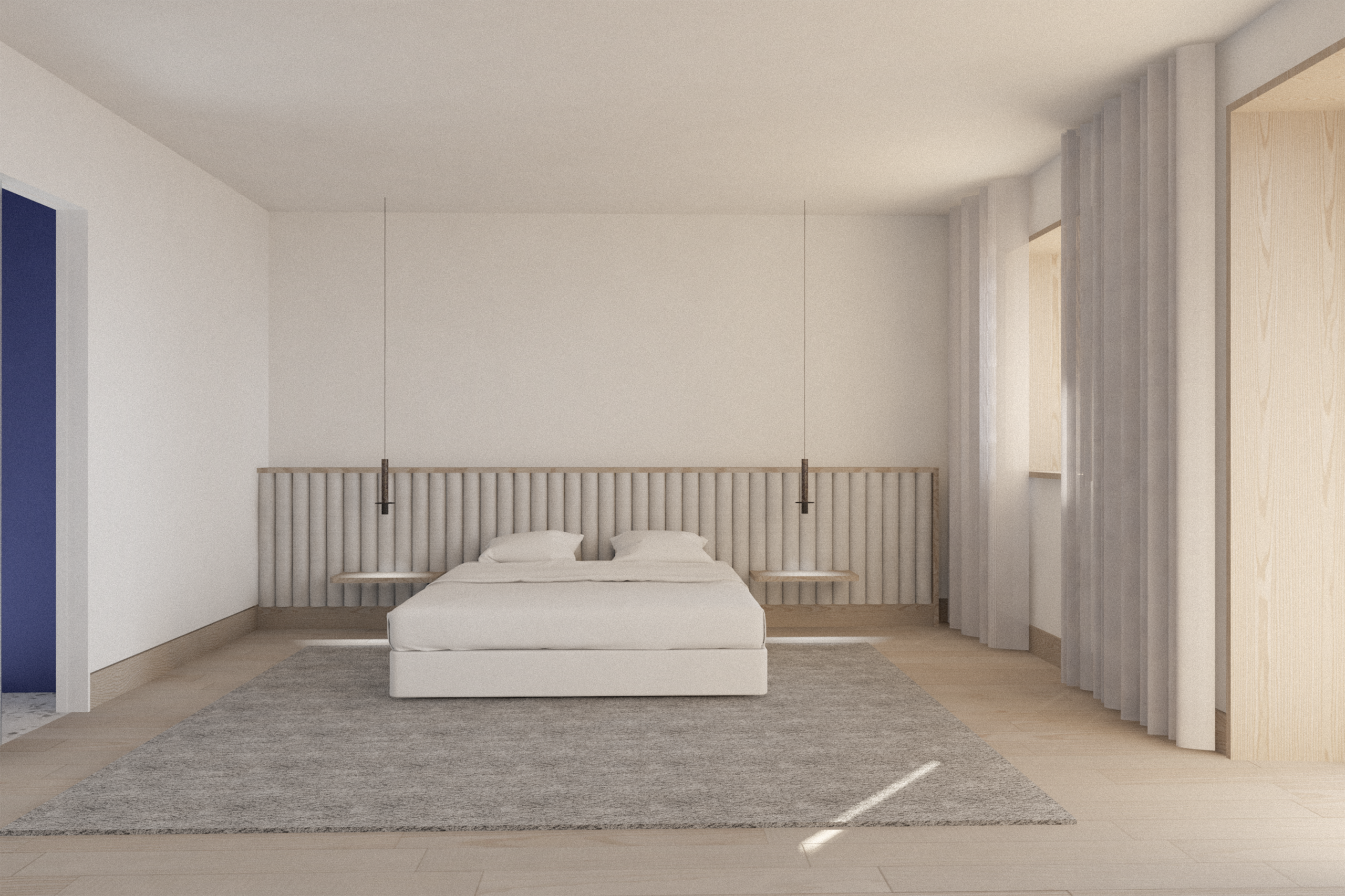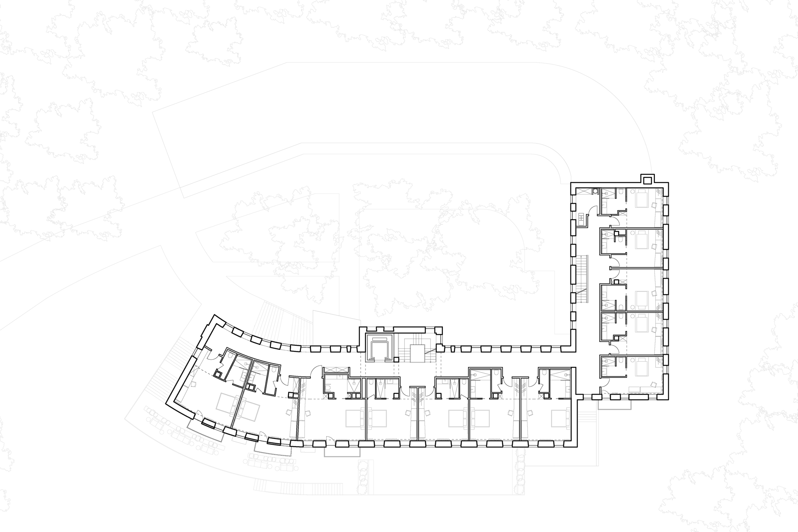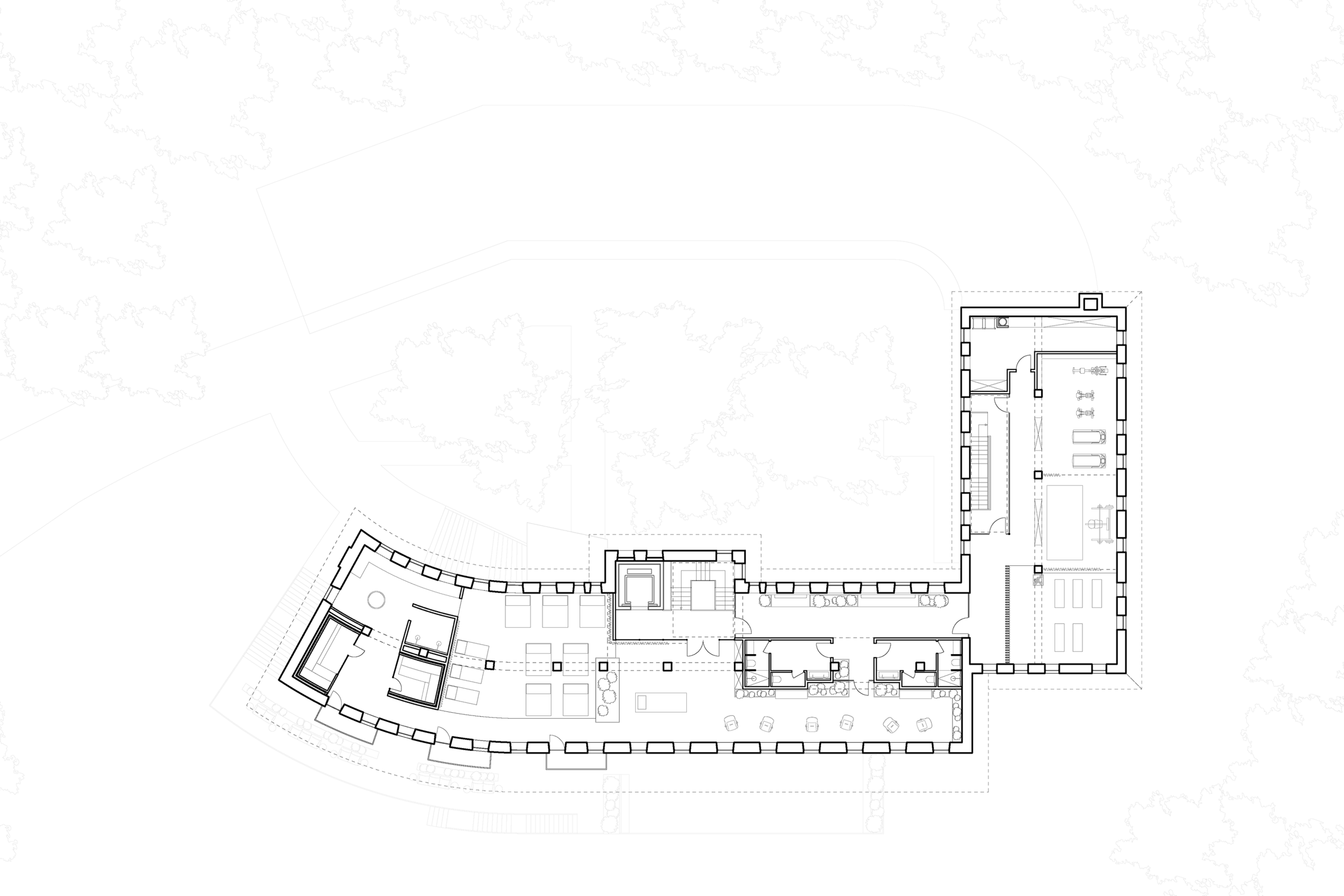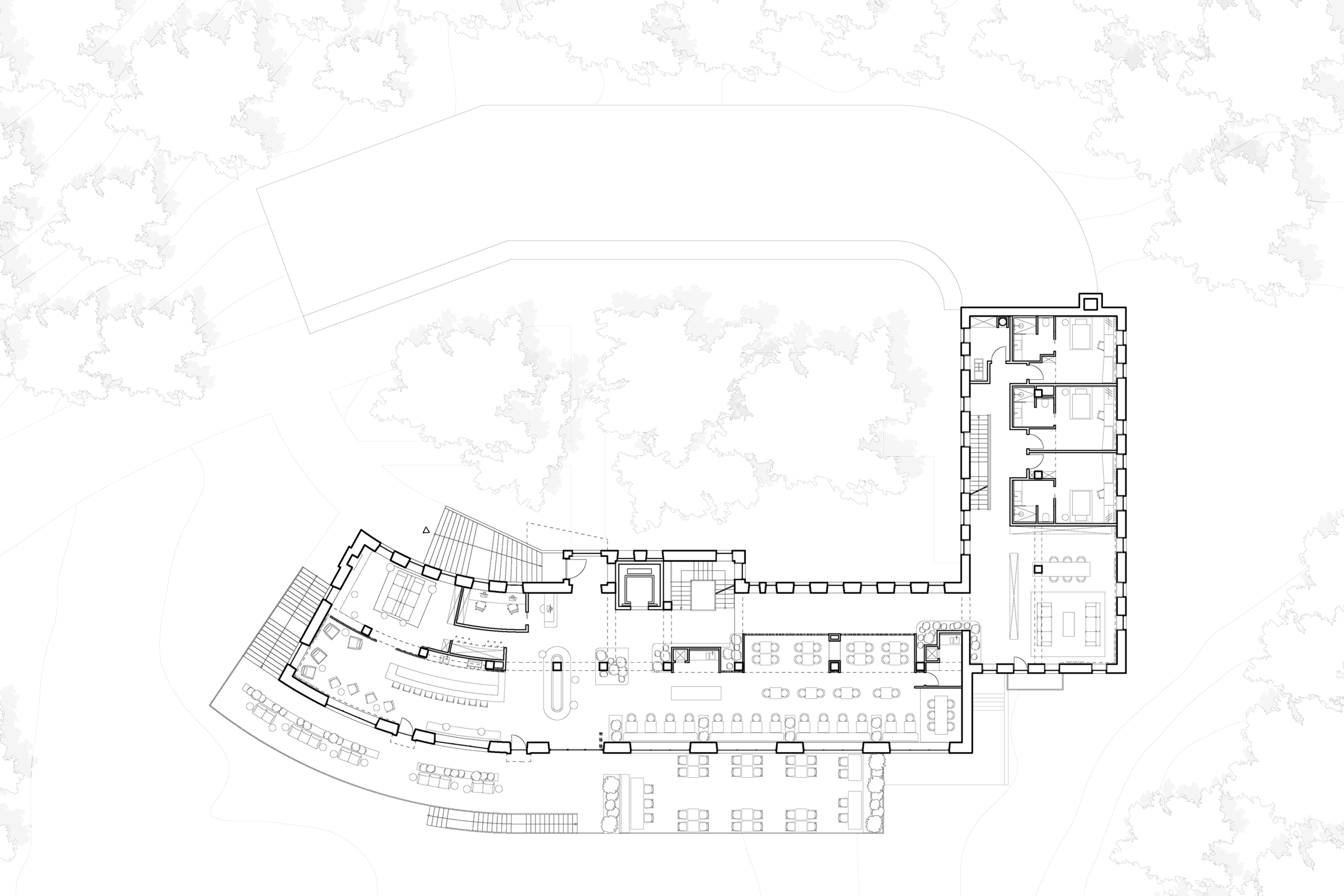 Die zentrale Ebene des neuen Hotels bildet das Erdgeschoss, welches über einen neuen Zugang auf der Hofseite erschlossen wird. Von der Rezeption an beginnend, öffnet sich der Raum zu einer großzügigen Lobby, die auf einer Seite in das Restaurant für Hausgäste und auf der anderen Seite in den Bereich der Hotelbar übergeht. Im Dachgeschoss befindet sich der neue Wellness- und Sportbereich. Hier soll ähnlich wie im Erdgeschoss vom Moment des Ankommens an der Ausblick und die Ausrichtung im Fokus stehen. Der Eingang ist offen gestaltet bis zur Fassade hin, an der sich der Raum über die gesamte Höhe öffnet. Eine neue Dachkonstruktion ermöglicht im Traufbereich mehr Raumhöhe und macht die darunterliegenden Flächen auch besser nutzbar.