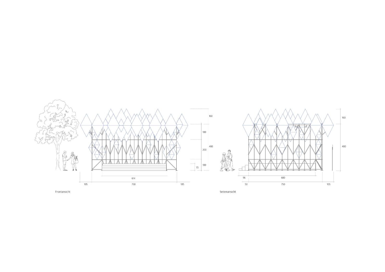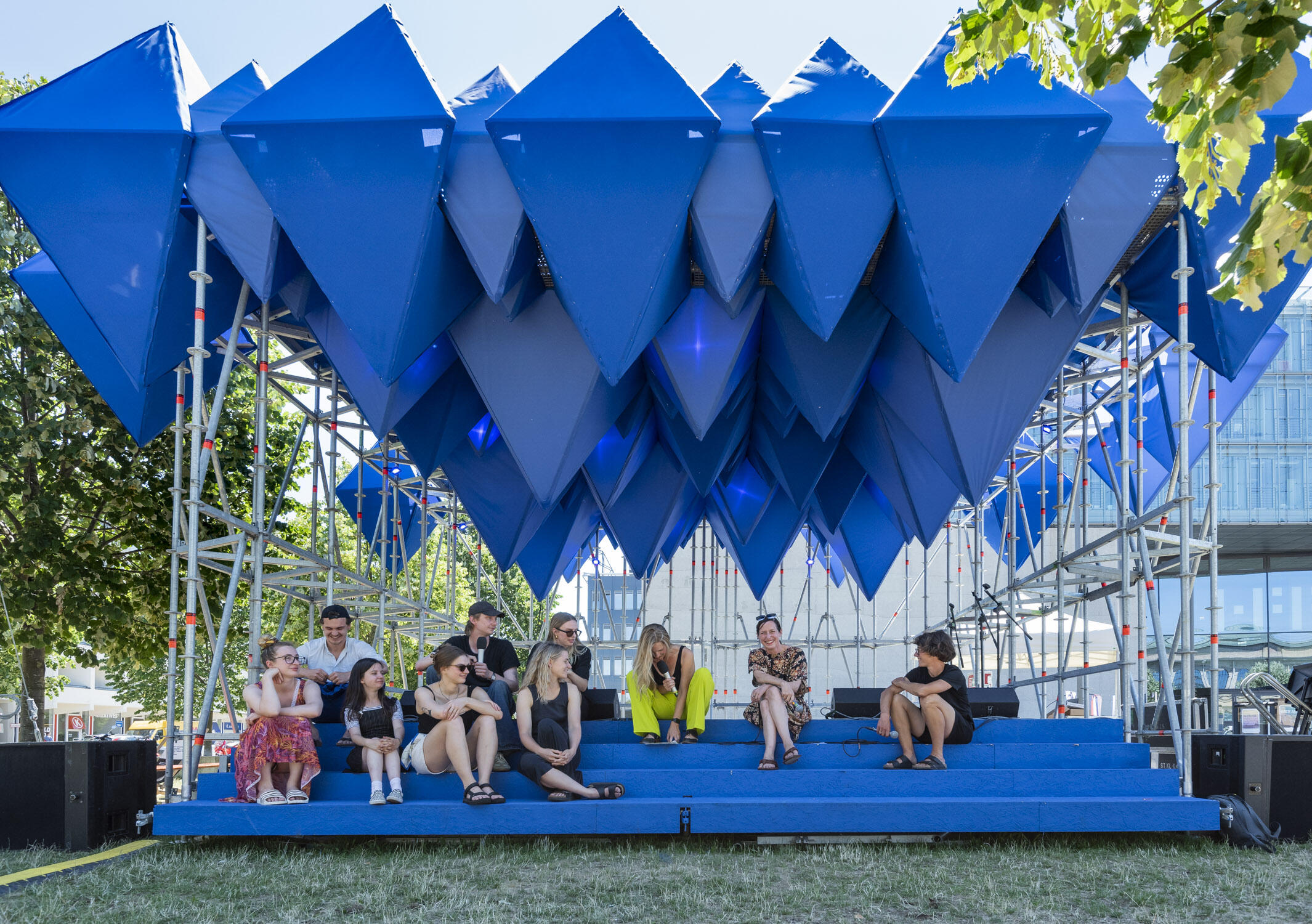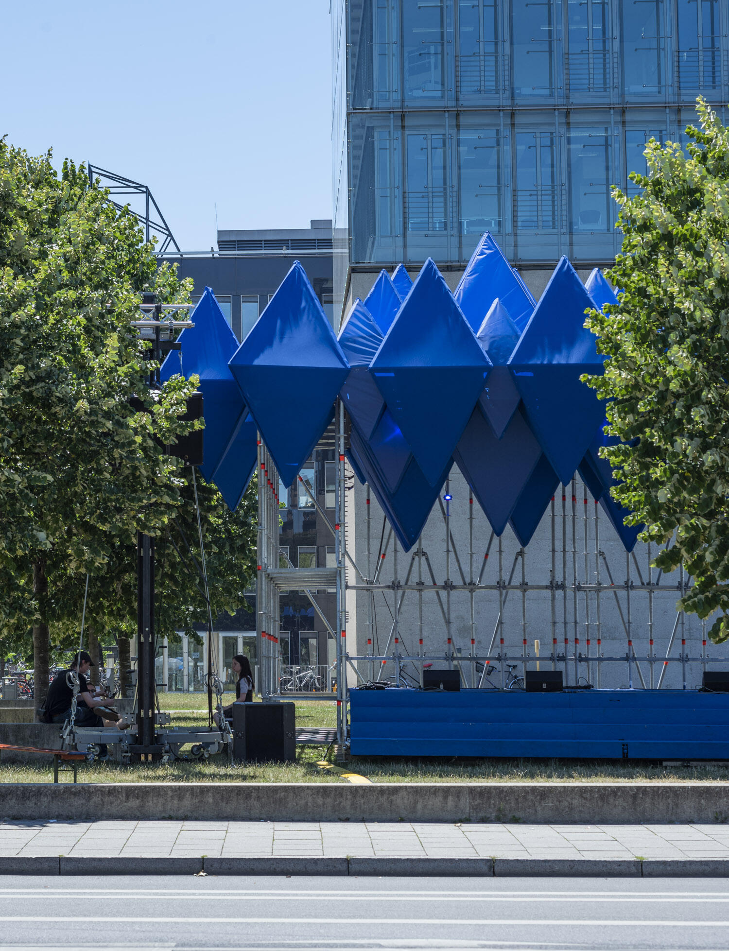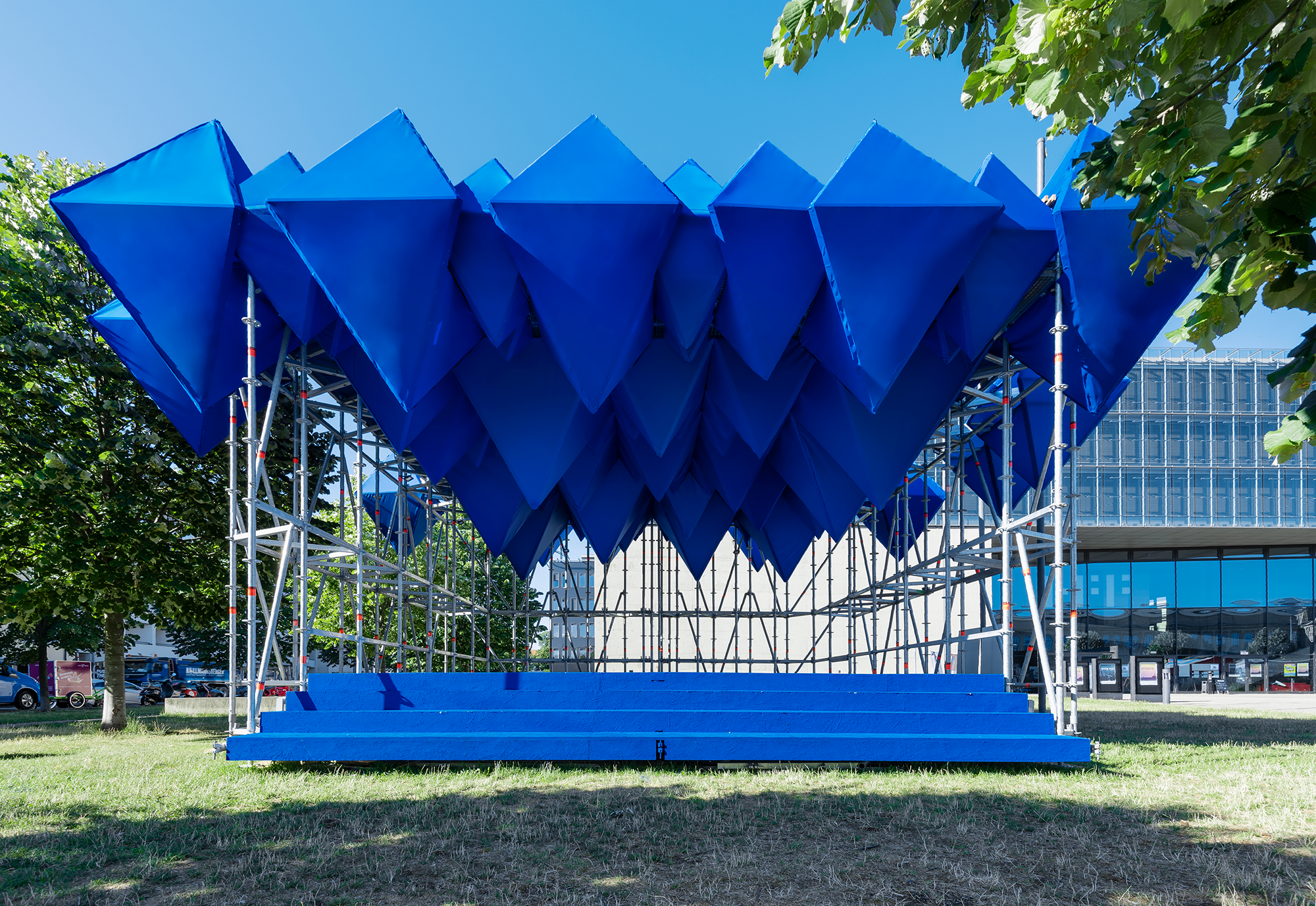 Das Gerüst des Pavillons wurde in Zusammenarbeit mit dem Unternehmen Lehner Gerüsttechnik entwickelt. Ein leichtes, dreidimensionales Fachwerkgestänge aus Stahl, das die nach einer Seite offene Bühne umgibt, kündigt durch seine Verstrebungen bereits die Struktur des Daches an. Letzteres wird aus einer Vielzahl von nach oben und unten gespiegelter, unterschiedlich großer, jedoch regelmäßiger Pyramiden gebildet. Ihre Größen folgen einem klaren Raster von 150, 100 und 50 Zentimetern Kantenlänge. Verschiedene Sondergrößen bilden Auskragungen am Rand der Konstruktion oder sind in das Traggerüst eingespannt beziehungsweise eingehängt. Alle Pyramiden sind aus Dachlatten konstruiert und mit blauem, teilweise reflektierendem Stoffen bespannt. Einige Pyramiden wiederum sind von innen beleuchtet. Das Spiel mit Licht und spiegelnden Oberflächen bricht die geometrische Struktur der Konstruktion auf, erzeugt Uneindeutigkeiten, lässt Raum zum Träumen. Der blaue Bühnenboden wiederum greift die Farbigkeit der „Wolkenarchitektur“ auf und schafft ein Gleichgewicht zwischen Bühnenboden und Bühnendecke.