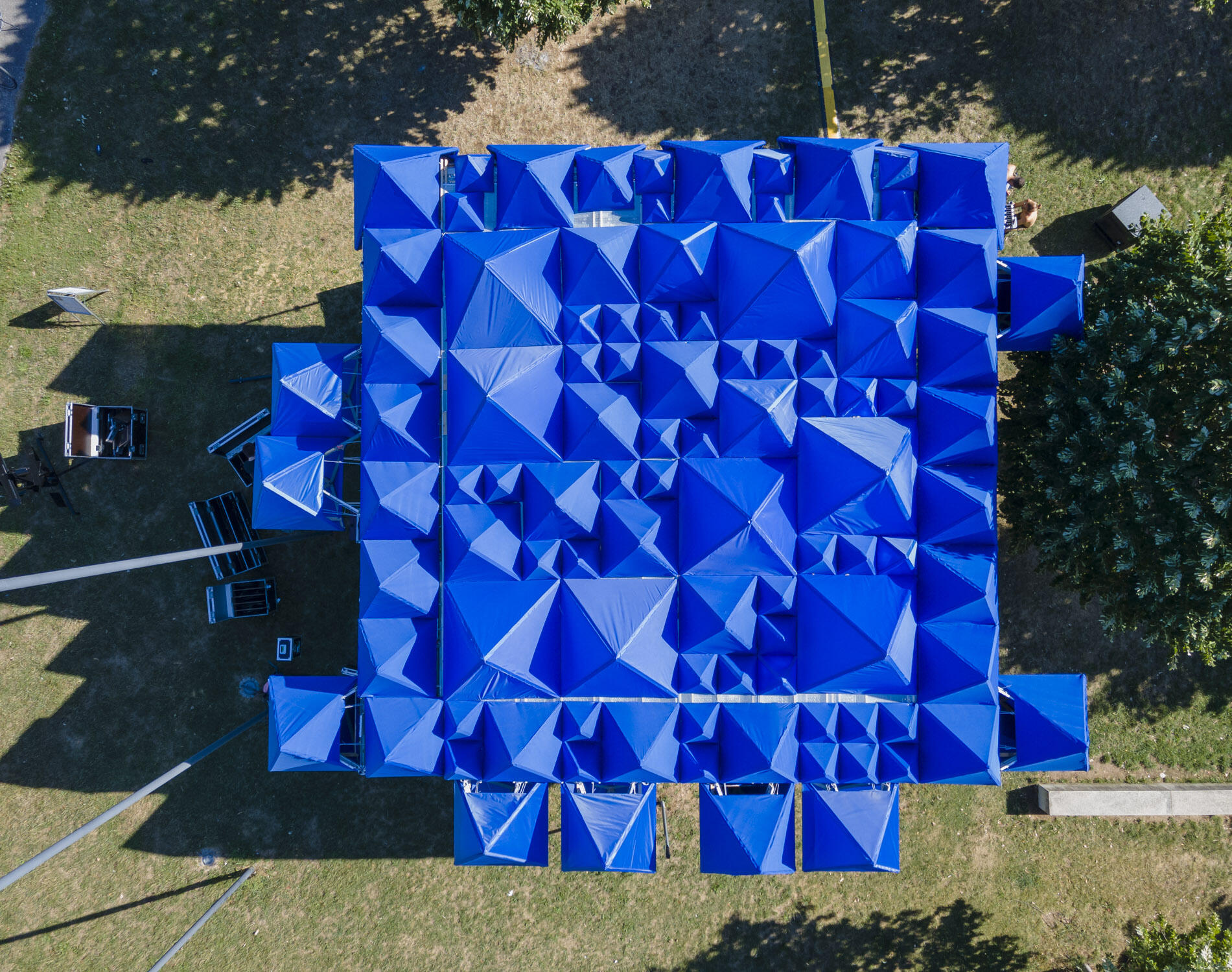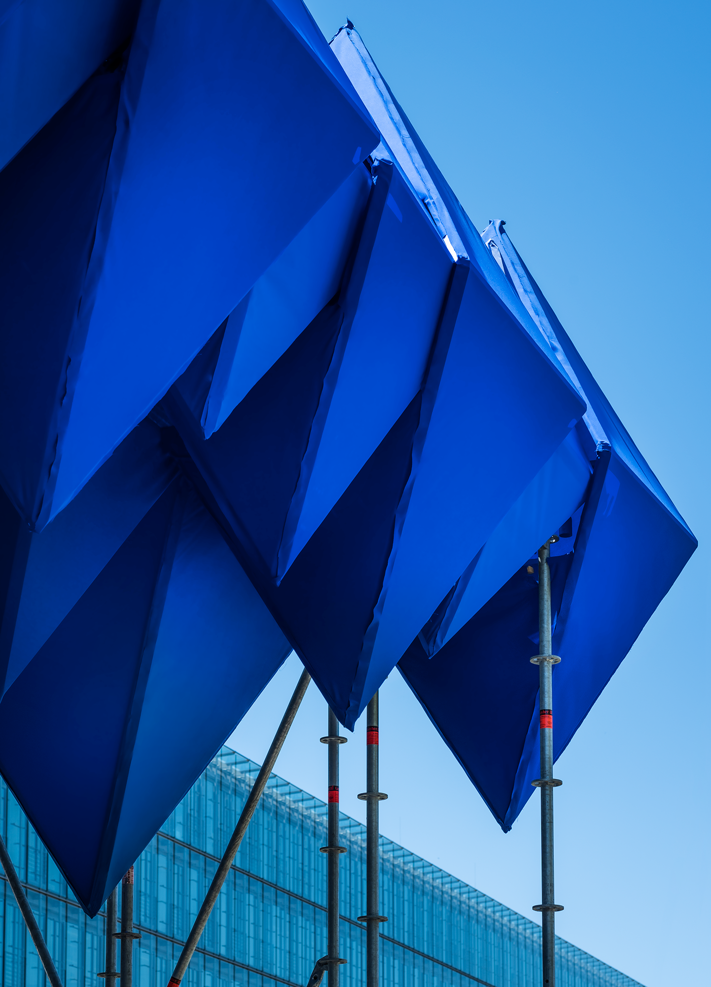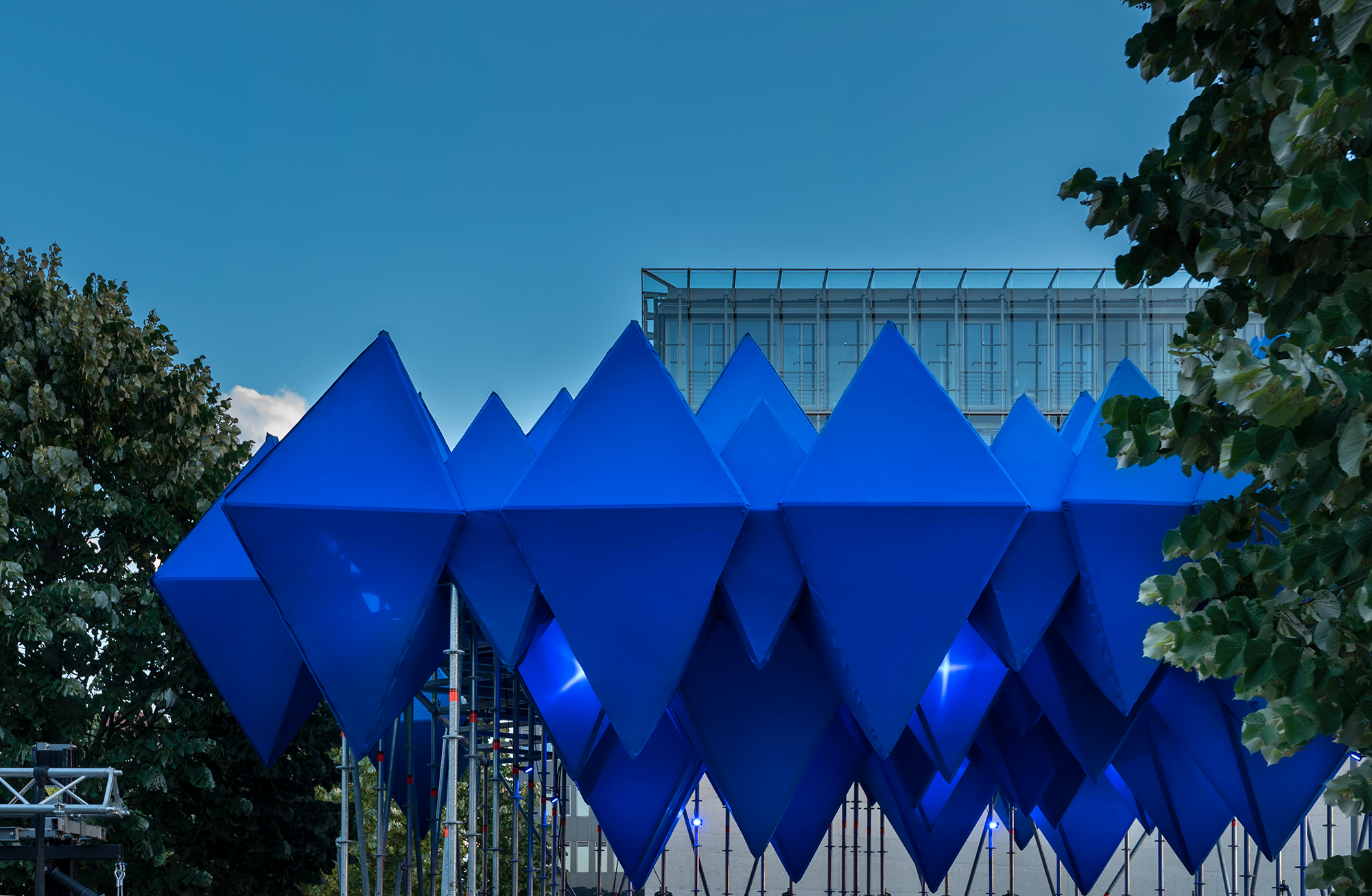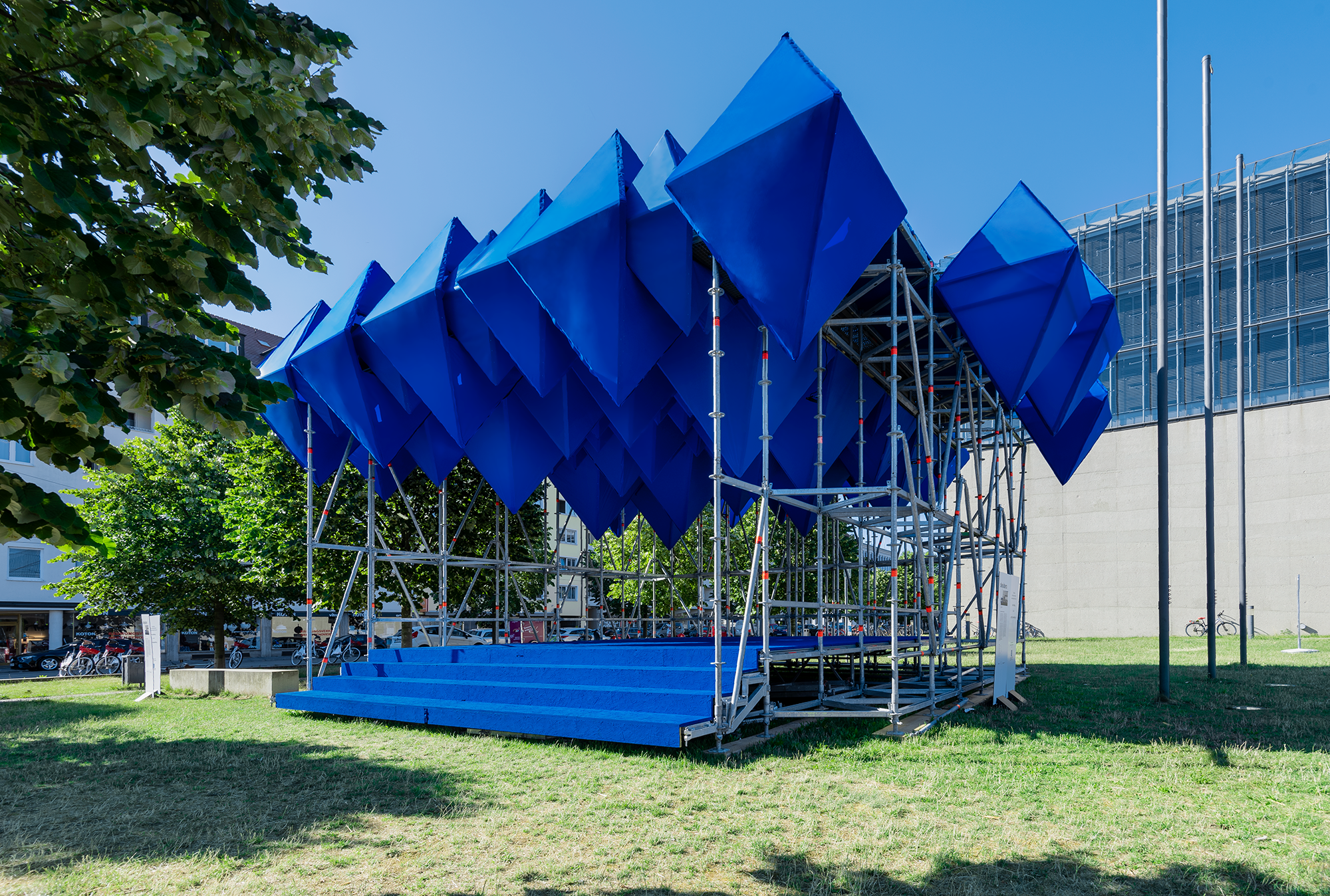 Seine Form ist, in Anlehnung an das Motto des diesjährigen Kunstareal-Festes „Sehnsucht“, von Wolkenbildern und dem träumerischen Blick in den blauen Himmel als Symbole der Sehnsucht inspiriert. Geometrische Strukturen, in unterschiedlichste Blau-Schattierungen getaucht, verbinden sich zu einer immersiven Installation, die die unendliche Tiefe eines Sommerhimmels einzufangen versucht. Es ist der Blick in die Unendlichkeit, in die Tiefen des Himmels, der in uns die Sehnsucht nach dem Anderen – einer anderen Zeit, einem anderen Ort, einem anderen Ich – spürbar werden lässt. Dass das dabei Erträumte oft nicht das Realisierbare und noch häufiger nicht einmal das wirklich Wünschenswerte darstellt, das gehört zum Symbol des Himmels. Die unterschiedlich großen – mal höher, mal kleiner; mal weiter, mal weniger – auskragenden Strukturen des Pavillons verleihen diesem Spannungsverhältnis Ausdruck.