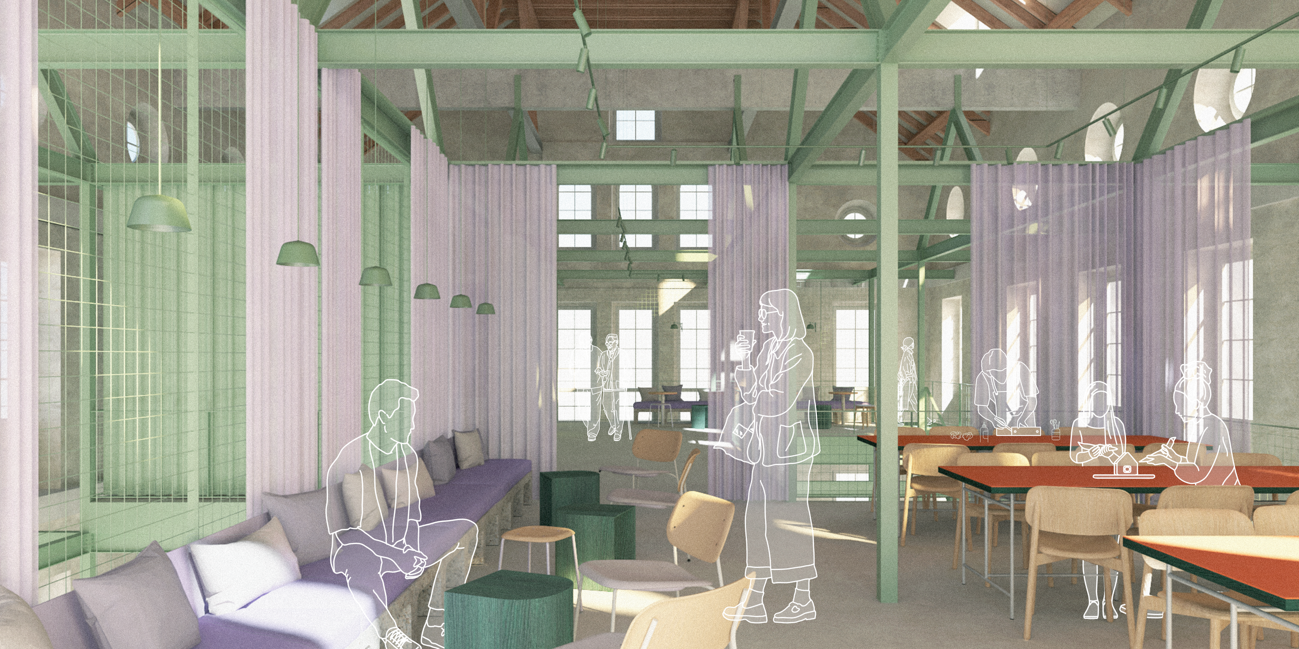 Die Materialwahl schafft einen Kontrast zwischen historischem Gebäude, industriellen Elementen und modernen Akzenten. Insgesamt entsteht ein lebendiger, offener Treffpunkt, der die Geschichte des Ge- bäudes bewahrt und sichtbar macht und gleichzeitig eine moderne, vielseitige Nutzung ermöglicht.