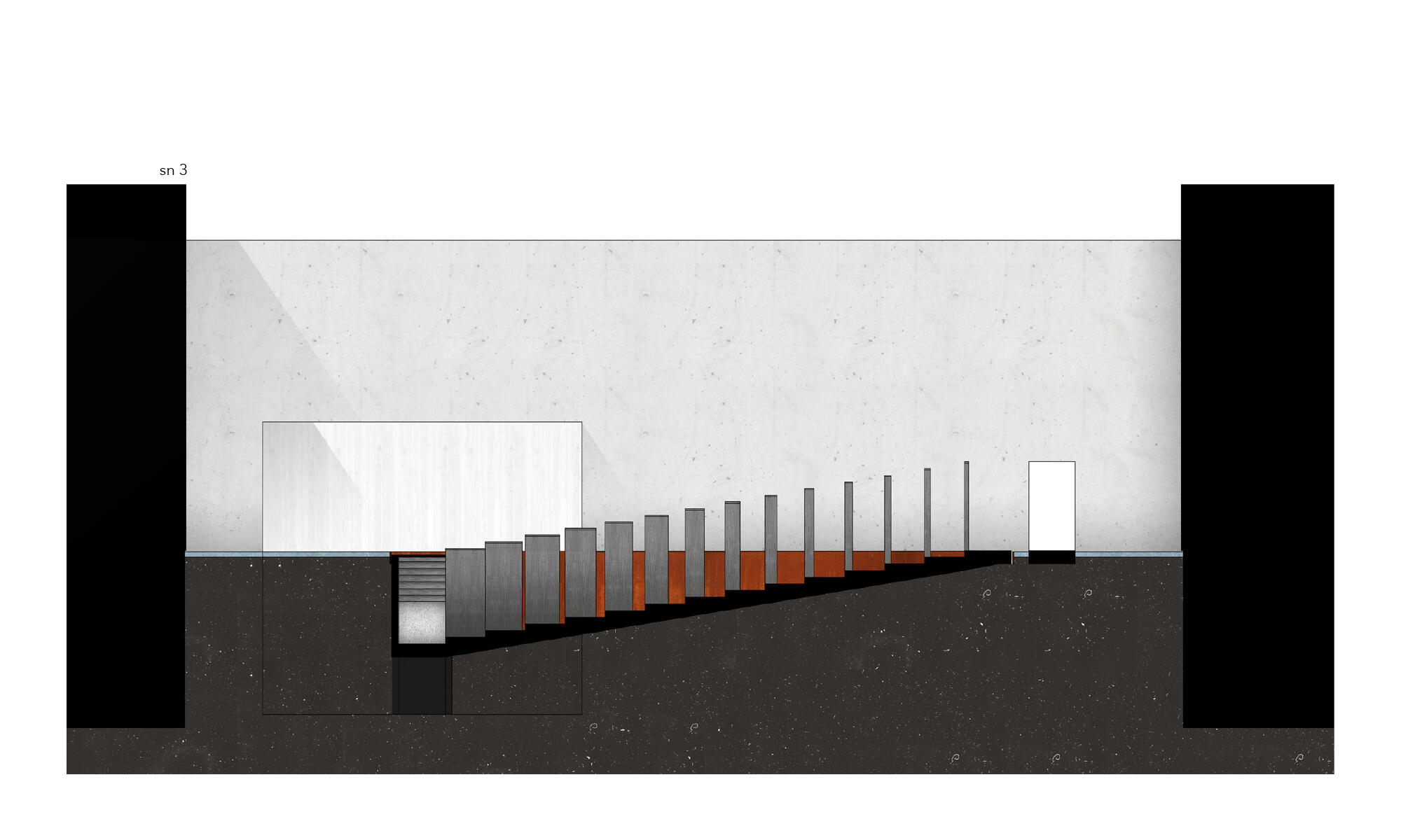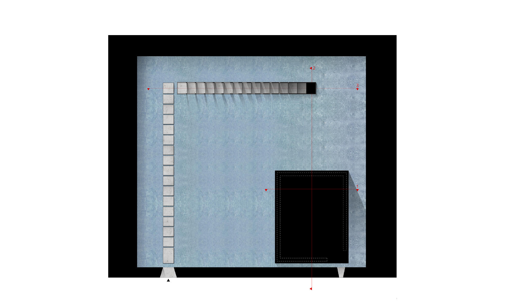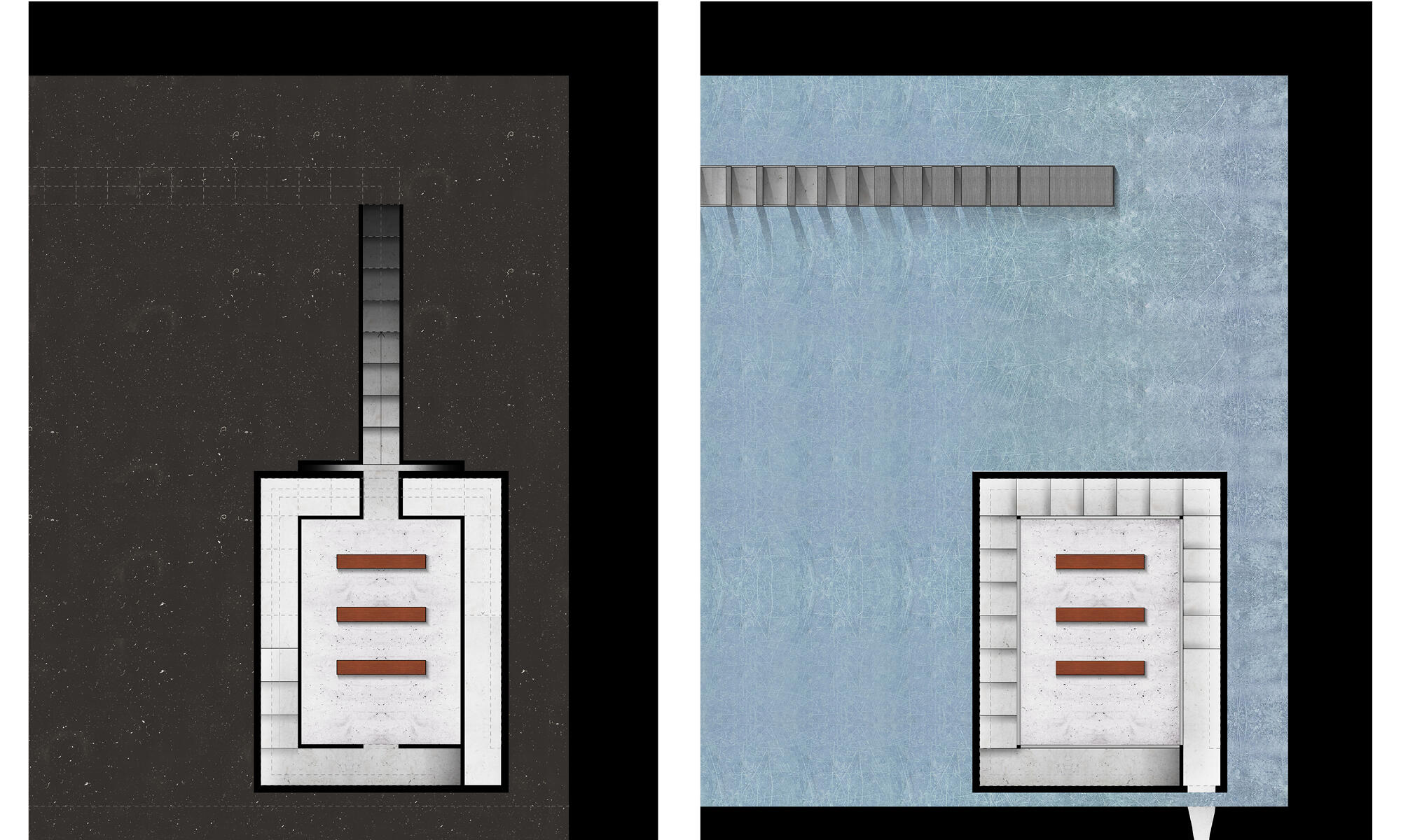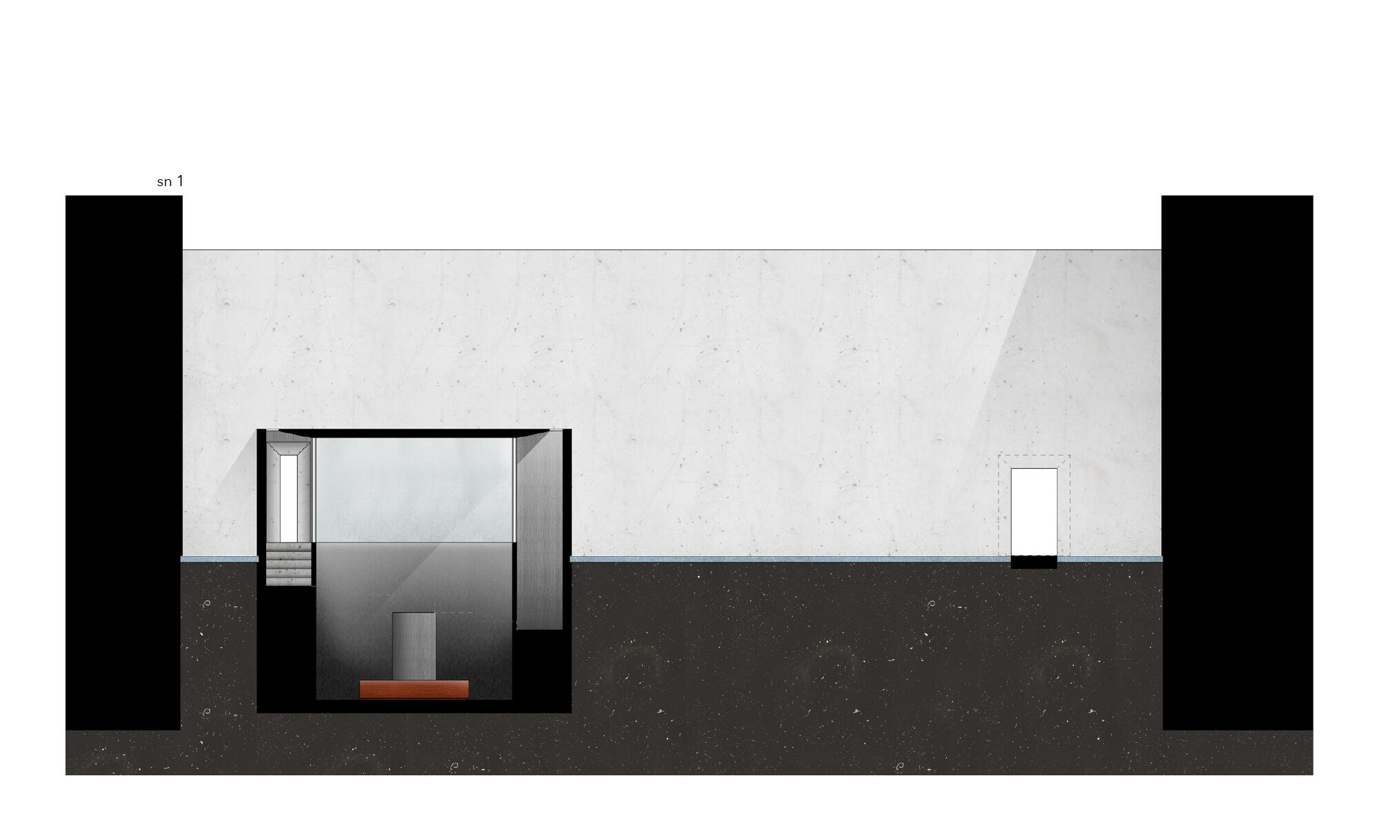 Die Architektur von Daniel Decius übersetzt diese identifizierten atmosphärischen Attribute zum einen in einen Außenraum mit großer, spiegelnder Wasserfläche, der sich, von allseits hohen Mauern umgeben, jeder Massstäblichkeit verweigert, zum anderen in einen sakral anmutenden unterirdischen Raum. Eine Korridor zwischen beiden Räumen, der mit beeindruckend gesetzten Lichtreflexen die dystopische Stimmung des Films aufgreift, gibt unmissverständliche Bewegungsrichtungen vor. Ebenso klar gesetzt werden Ein- und Austritt in diese Architektur.