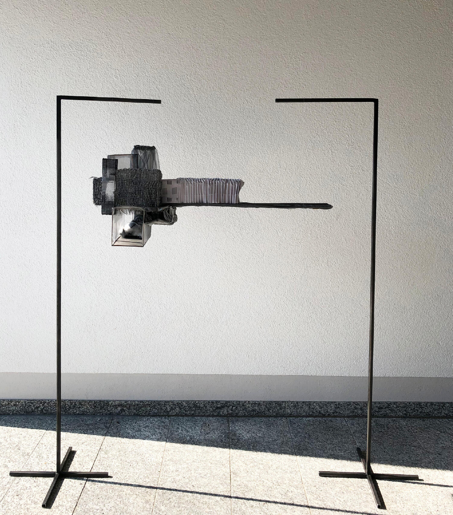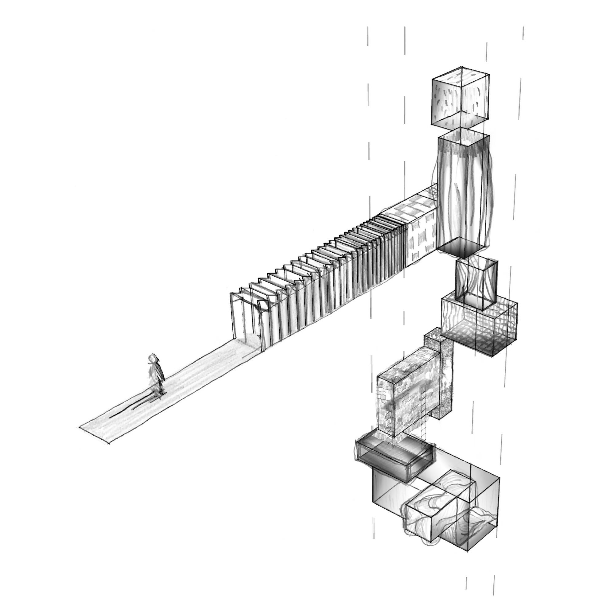 "Der Film beginnt mit einem Verkehrsunfall, bei dem Julie ihre Tochter und ihren Mann verliert. Sie bricht radikal mit dem bisherigen Leben, versucht vor der eigenen Erinnerung zu flüchten und baut sich eine vollkommen neue Existenz auf. Die Freiheit, die die Protagonistin wählt, indem sie sich von allen Dingen des vorherigen Lebens trennt, hilft ihr nicht. Erst als sie sich auf die Vergangenheit einlässt gelingt es ihr, sich von ihrem Schmerz zu befreien. Das Gedächtnis ist ein Konstrukt aus willkürlichen und unwillkürlichen Assoziationen - es ist die Fähigkeit, Sinneswahrnehmungen oder psychische Vorgänge im Gehirn zu speichern, sodass sie wieder ins Bewusstsein treten können. Die Verschiedenartigkeit der Erinnerungen findet sich in unterschiedlichen Fertigungstechniken des selben Stoffes wieder. Der Stoff umhüllt zusammenhängende Räume, die auf unterschiedlichen Wegen miteinander verknüpft sind und ein Raumkonstrukt bilden, in dem man durch die vielen Schichten des Stoffes die Orientierung verliert und an Erlebtes erinnert wird. Den Weg in die Zukunft bildet ein langer Flur, der von einem plissiertem Stoff gerahmt wird. Die Beweglichkeit dieser Struktur symbolisiert den nicht definierten Zeitraum der Transformation, der mal kürzer und mal länger wirkt. Der Boden besteht aus einem gespanntem Stoff mit eingewobenen LED-Fasern, die beim Betreten leuchten. Die Zukunft ist ein nicht definierter Raum. Man befindet sich immer auf dem Weg dorthin und erweitert das Konstrukt um neue Erinnerungsräume." (Lisa Schmidhuber)