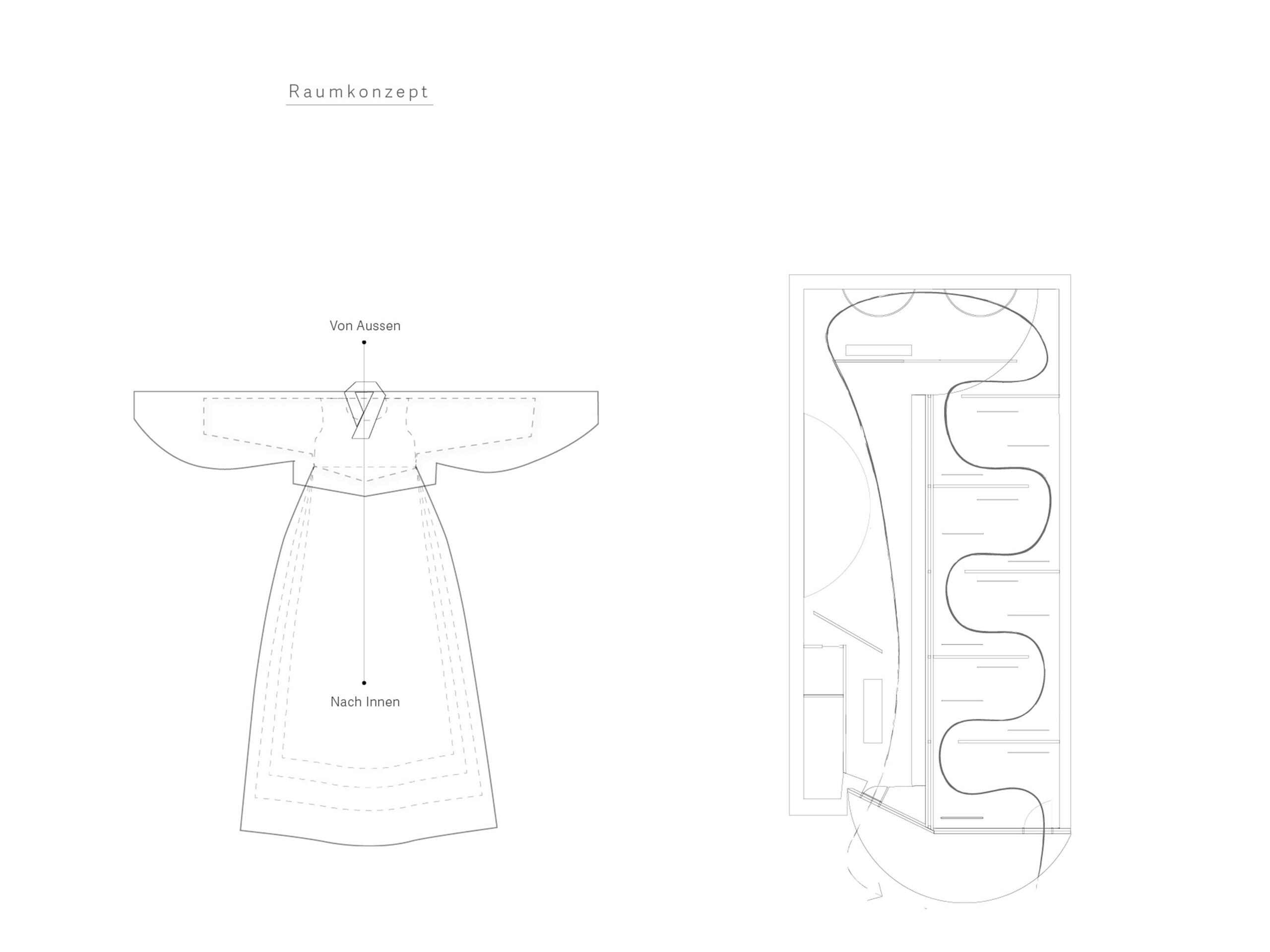 Der Entwurf von Rose Bröckel greift die Struktur des traditionellen, koreanischen, Gewands „Hanbok“ auf und interpretiert diese als innenräumliches Organisationsprinzip aus Schichten und Scheiben. Die dadurch entstehende Raumfolge besticht durch eine Atmosphäre, die die Sinnlichkeit und Natürlichkeit der von ihr ausgewählten Designerin Kim Young Jin transportiert.