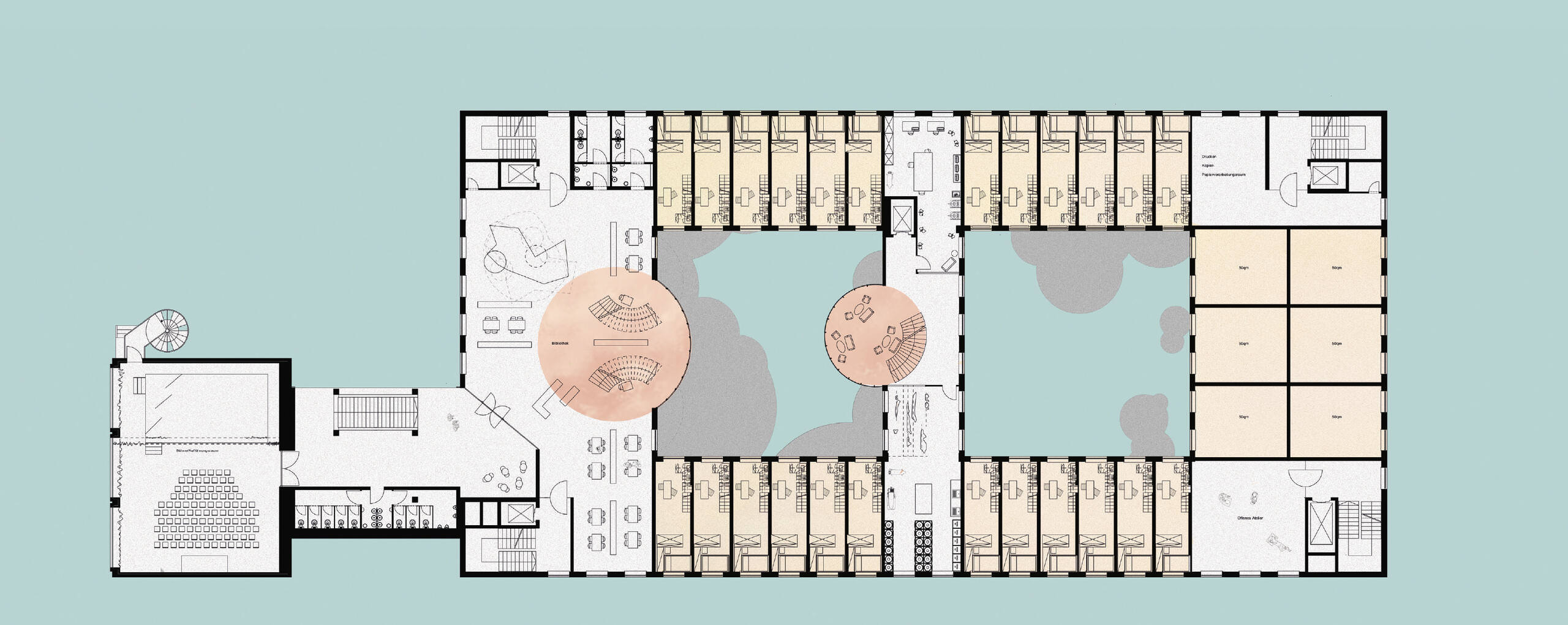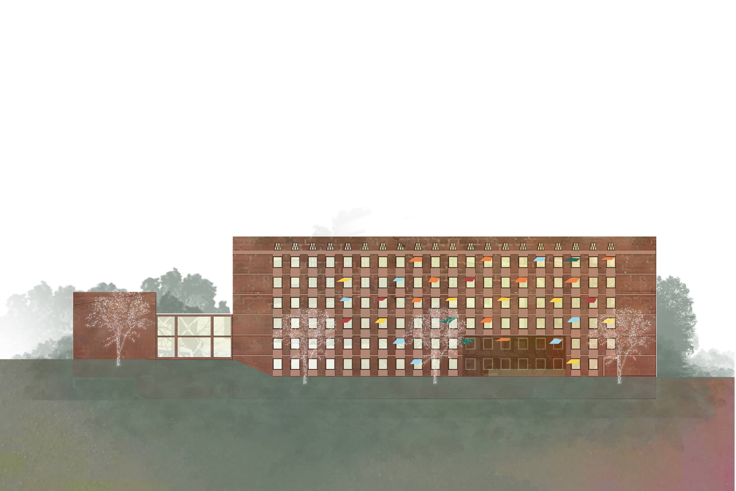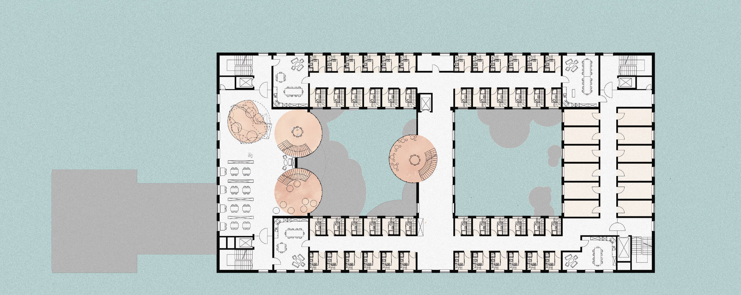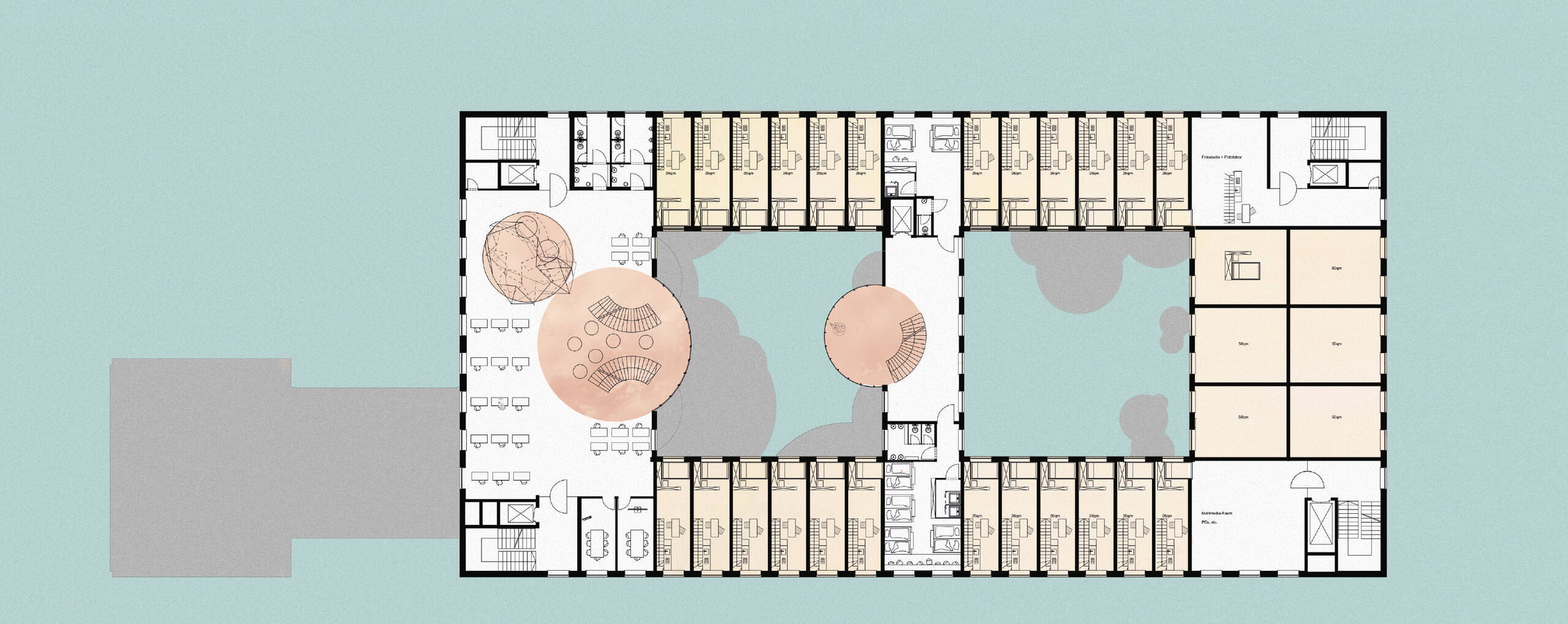 In ihrem Entwurf für die Umnutzung eines Bürogebäudes in einen gemeinschaftlichen Wohnkomplex für Jugendliche/junge Erwachsene legt Sharina Kimura einen besonderen Schwerpunkt auf die Verknüpfung des Komplexes mit der angrenzenden Nachbarschaft. Sie schafft einen fließenden Übergang von öffentlichen Räumen zu den privateren Bereichen der Bewohner. So werden Räume entwickelt, die sich sowohl zum Kennenlernen und Austauschen als auch für privatere Zusammenkünfte eignen. Dies insbesondere mit dem Fokus auch Jugendlichen oder jungen Erwachsenen, die sich in einer schwierigen Lebensphase befinden, ein Zuhause anbieten zu können, das mehr sein kann als nur ein bloßes Dach über dem Kopf.