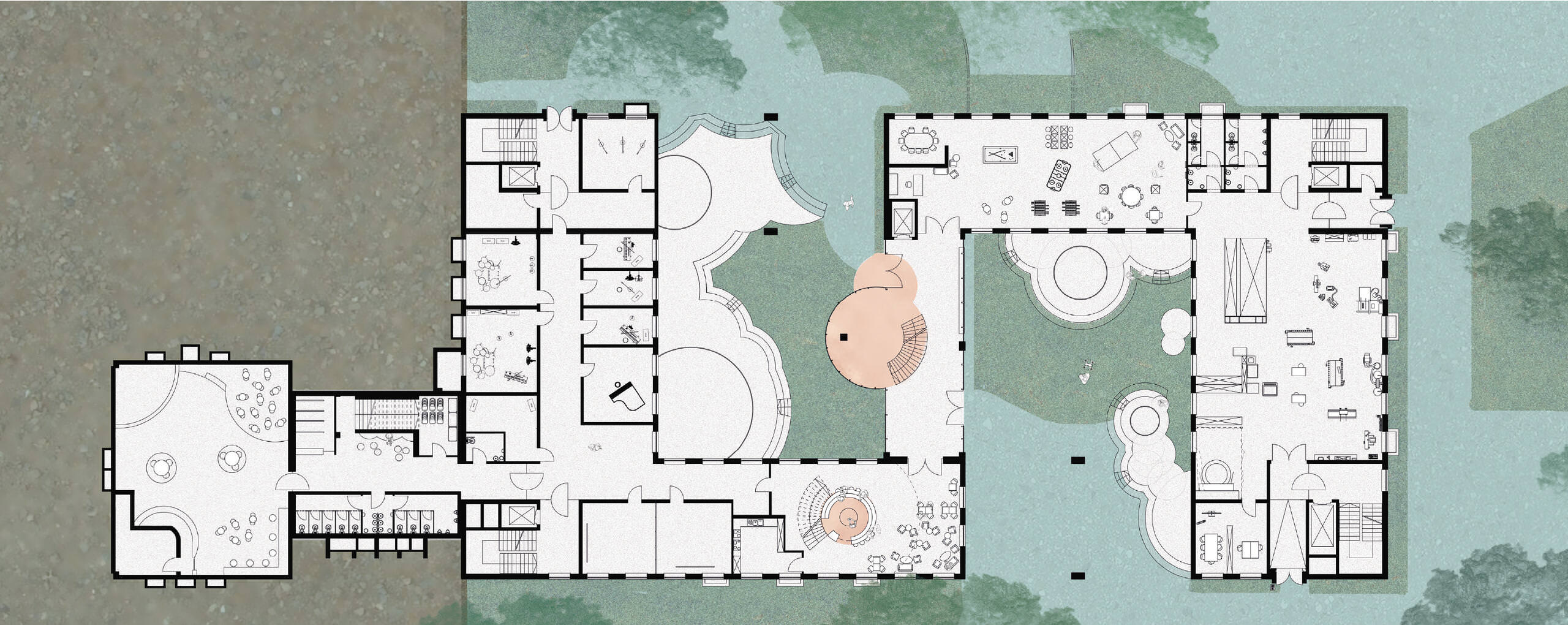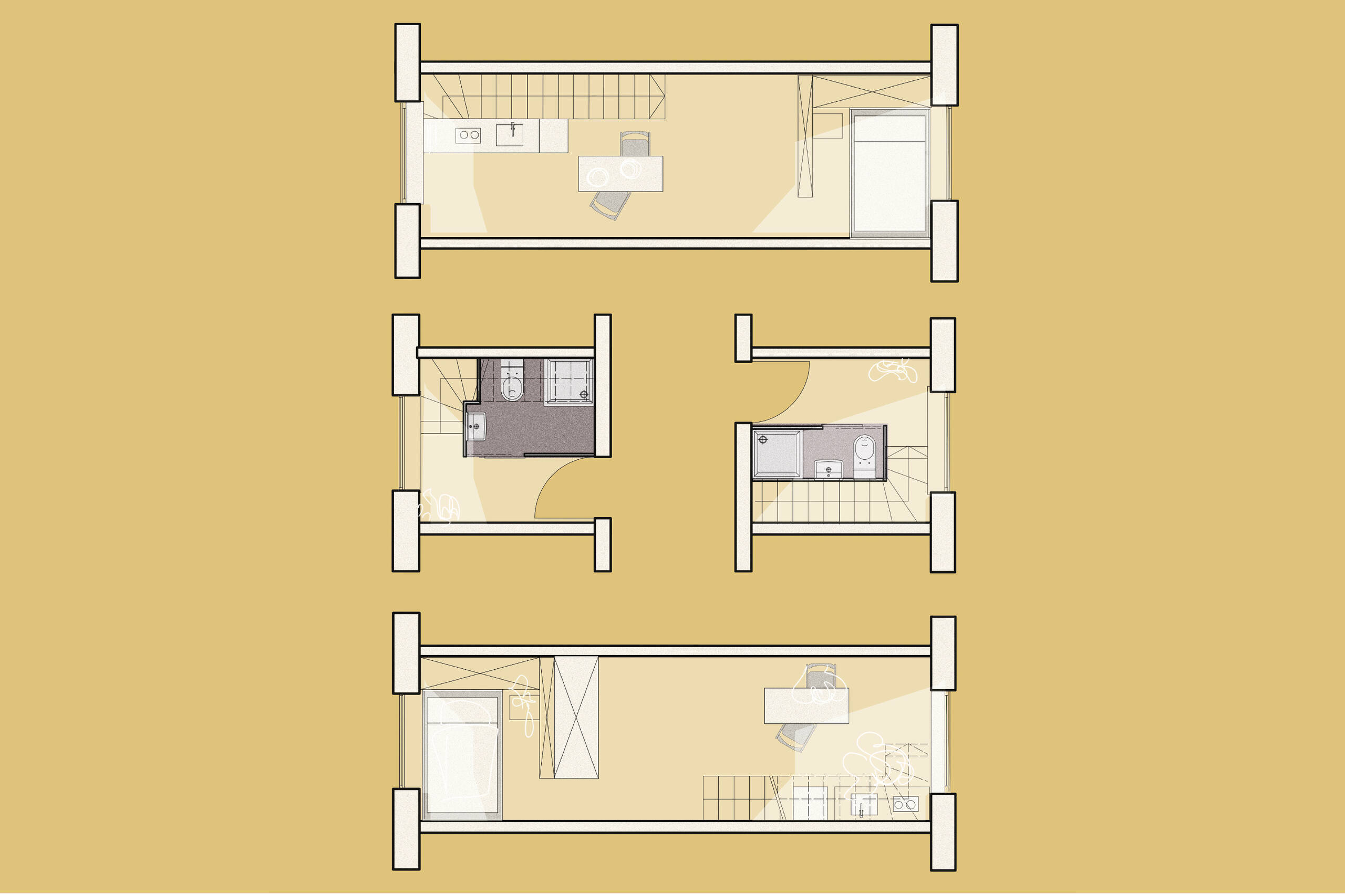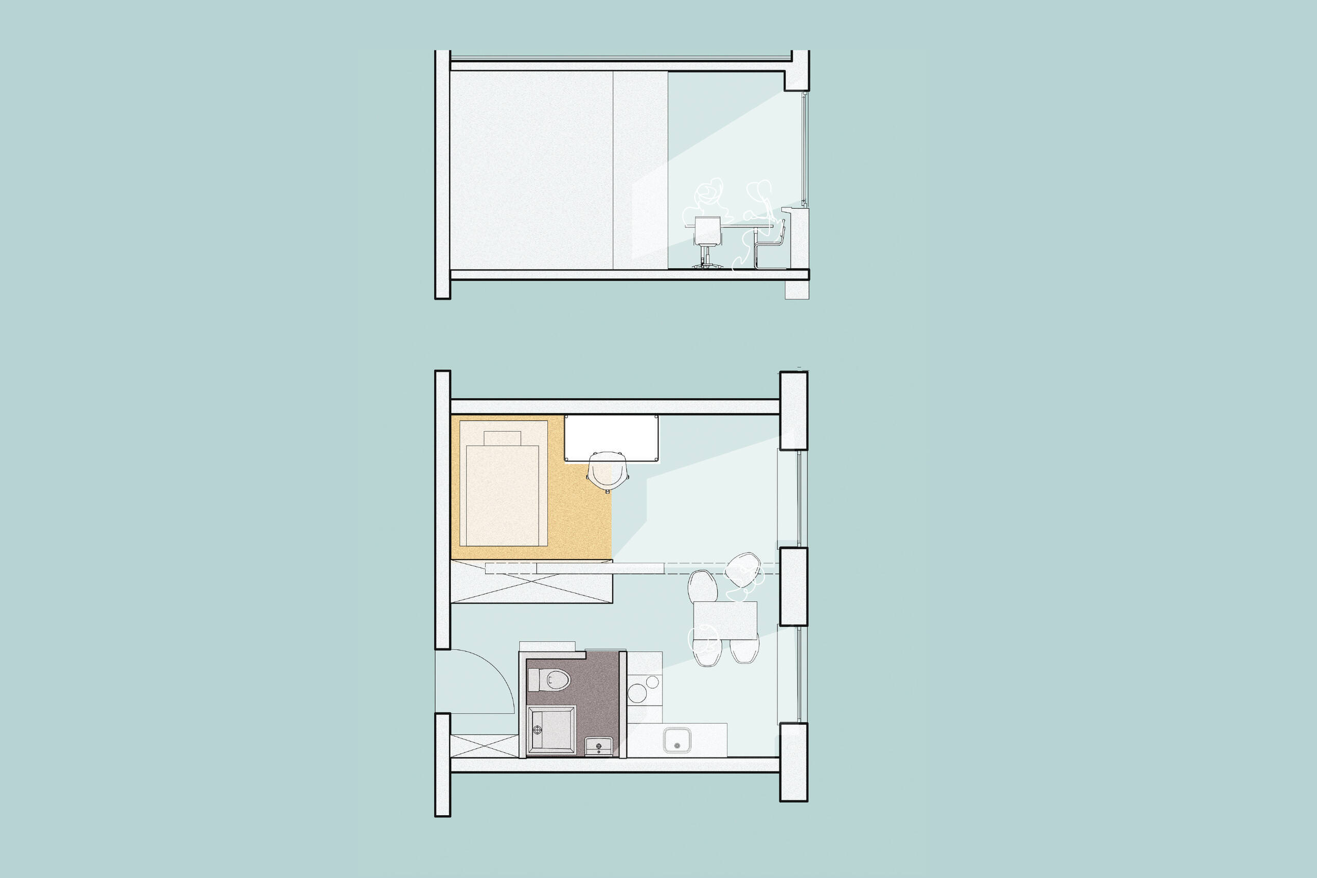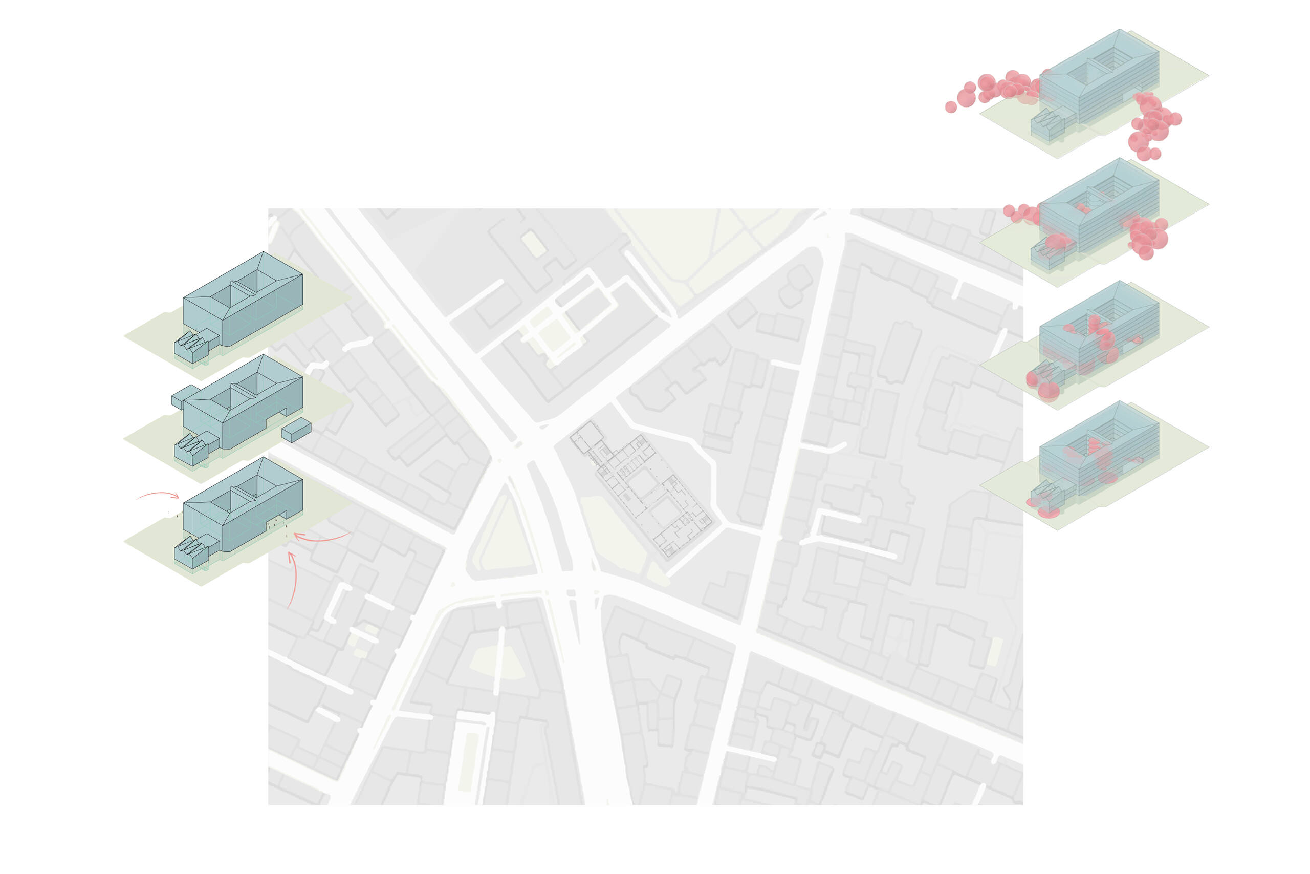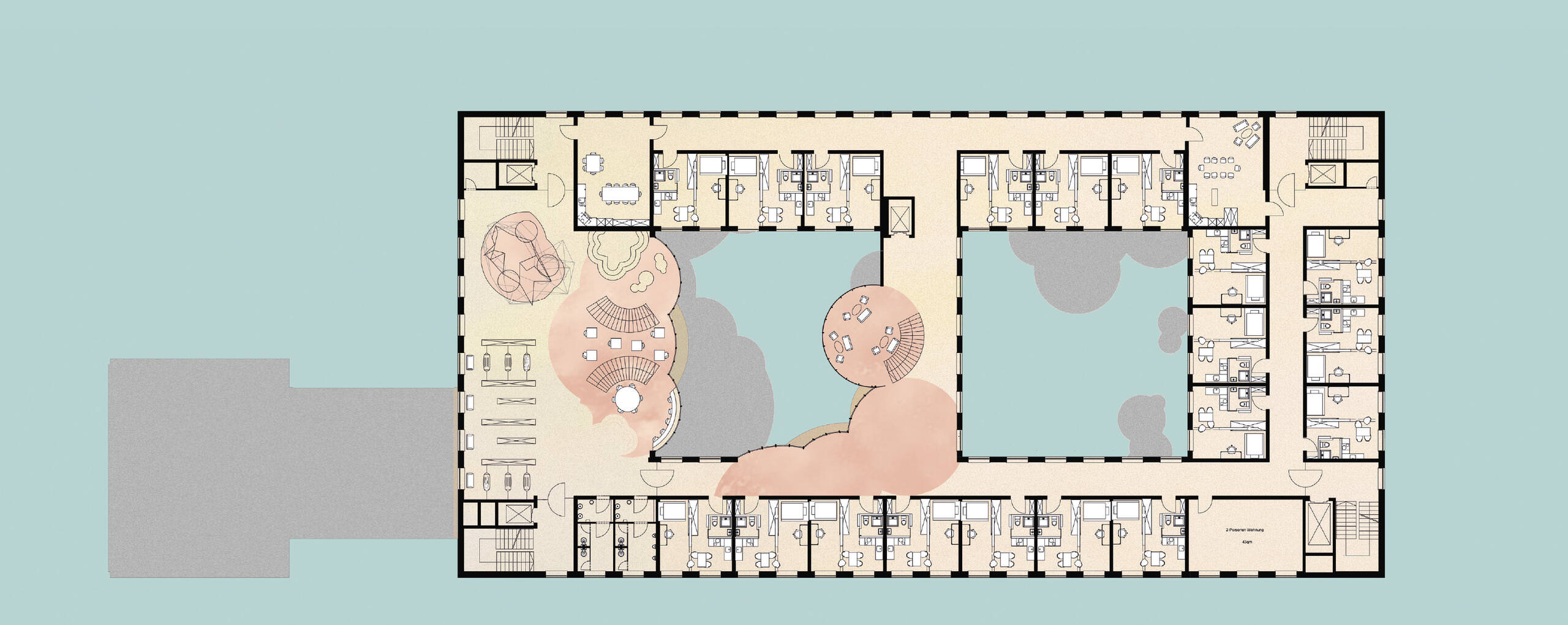 In ihrem Entwurf für die Umnutzung eines Bürogebäudes in einen gemeinschaftlichen Wohnkomplex für Jugendliche/junge Erwachsene legt Sharina Kimura einen besonderen Schwerpunkt auf die Verknüpfung des Komplexes mit der angrenzenden Nachbarschaft. Sie schafft einen fließenden Übergang von öffentlichen Räumen zu den privateren Bereichen der Bewohner. So werden Räume entwickelt, die sich sowohl zum Kennenlernen und Austauschen als auch für privatere Zusammenkünfte eignen. Dies insbesondere mit dem Fokus auch Jugendlichen oder jungen Erwachsenen, die sich in einer schwierigen Lebensphase befinden, ein Zuhause anbieten zu können, das mehr sein kann als nur ein bloßes Dach über dem Kopf.