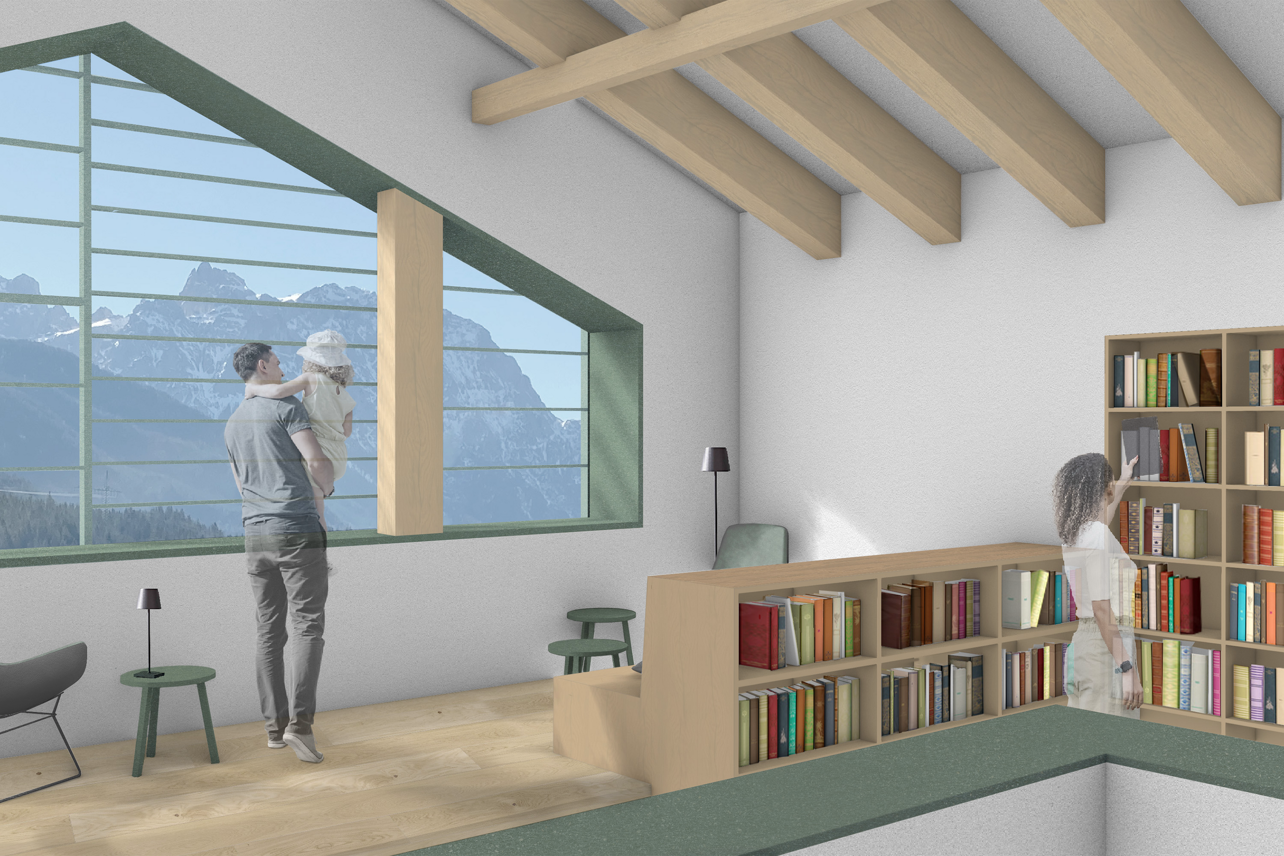 Die Revitalisierung eines Bestandsgebäudes im Herzen der alpenvorländischen Gemeinde Krün zielt darauf ab, die kulturelle und architektonische Identität der Region zu stärken. Das Konzept der Schmökerei vereint eine Bibliothek und ein Café, um sowohl die lokale Bevölkerung als auch den Tourismus anzusprechen. Eine klare horizontale und vertikale Strukturierung des Gebäudes in Kombination mit einer offenen Raumgestaltung ermöglicht eine schnelle und mühelose Orientierung. Das Zusammenspiel funktionaler und ästhetischer Elemente schafft eine inspirierende Umgebung, welche die Neugier weckt und die Besucherlnnen dazu ermutigt, die vielfältigen Nutzungsbereiche des Gebäudes zu erkunden. Die Verwendung dezenter Farbtöne und traditioneller Materlalien erzeugt ein harmonisches Zusammensplel zwischen Büchern, Besucherinnen und Architektur. Es entsteht eine stimmige Atmosphäre, die gleichermaßen das Lernen und die Entspannung fördert. Ländliche Motive werden auch in der Fassade neu interpretiert, wodurch sich das Gebäude trotz Umnutzung und Neugestaltung harmonisch in das bestehende Ortsbild integrert.