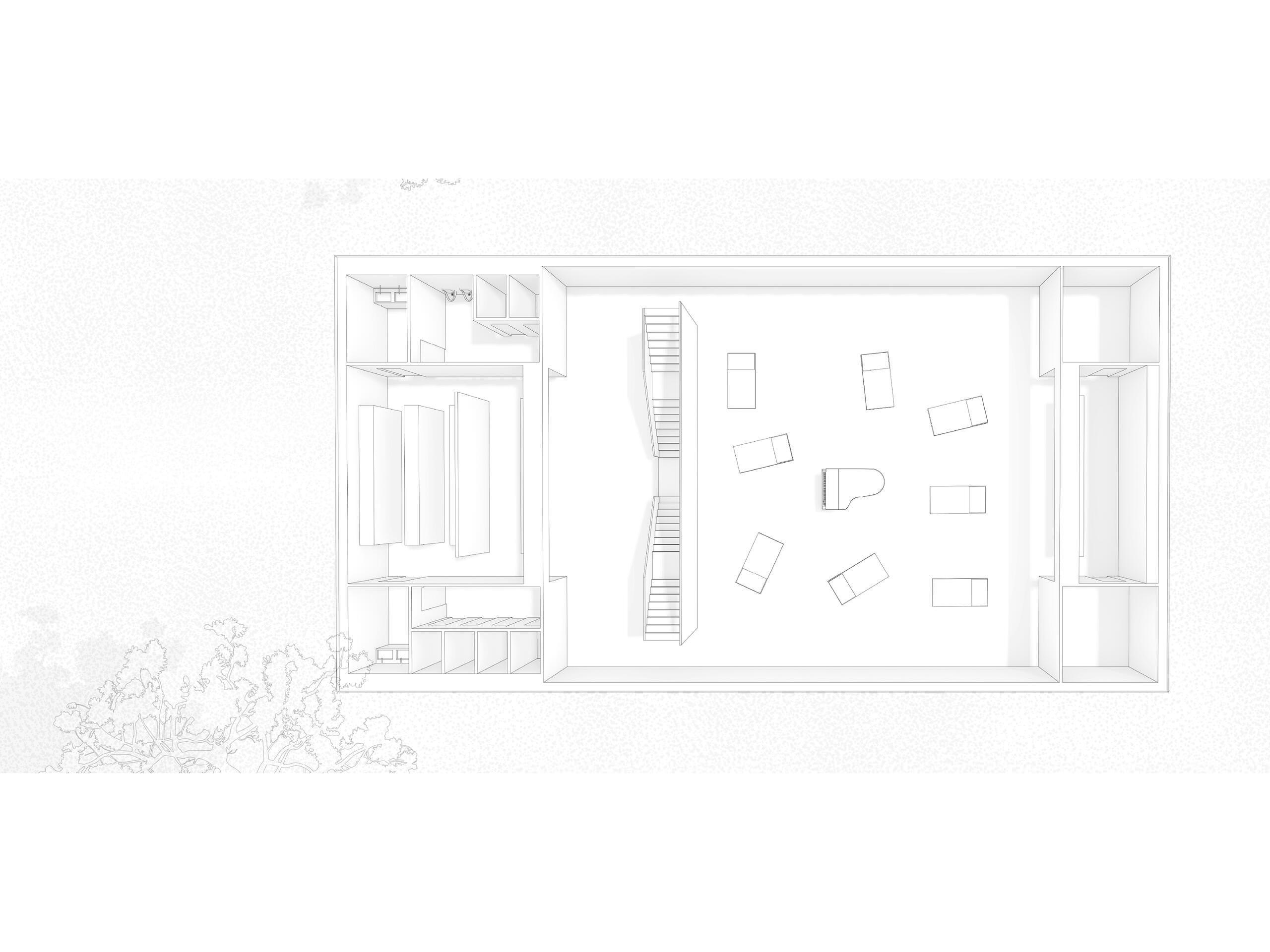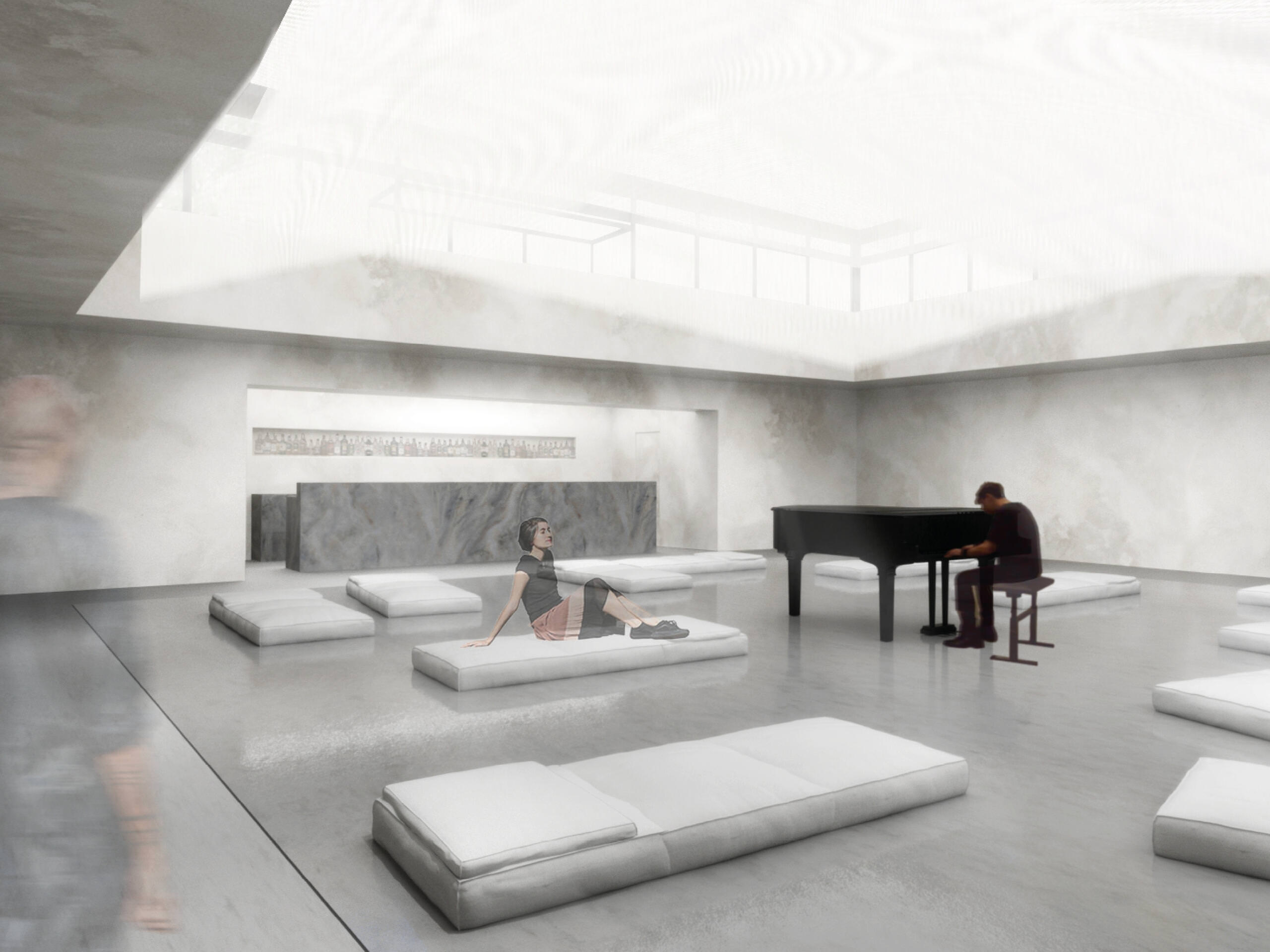Fritz Buziek entwirft eine pneumatische Decke, die direkt auf Musik reagiert und so permanent den darunter liegenden Raum transformiert. Durch das „Tanzen“ der Decke schafft er spezifische Situationen, die entsprechend der Musik – und damit auch der gewünschten Stimmung – variieren. Der Raum unter der Decke wird als Musikerfahrungsraum oder einfach als Konzertsaal entwickelt.